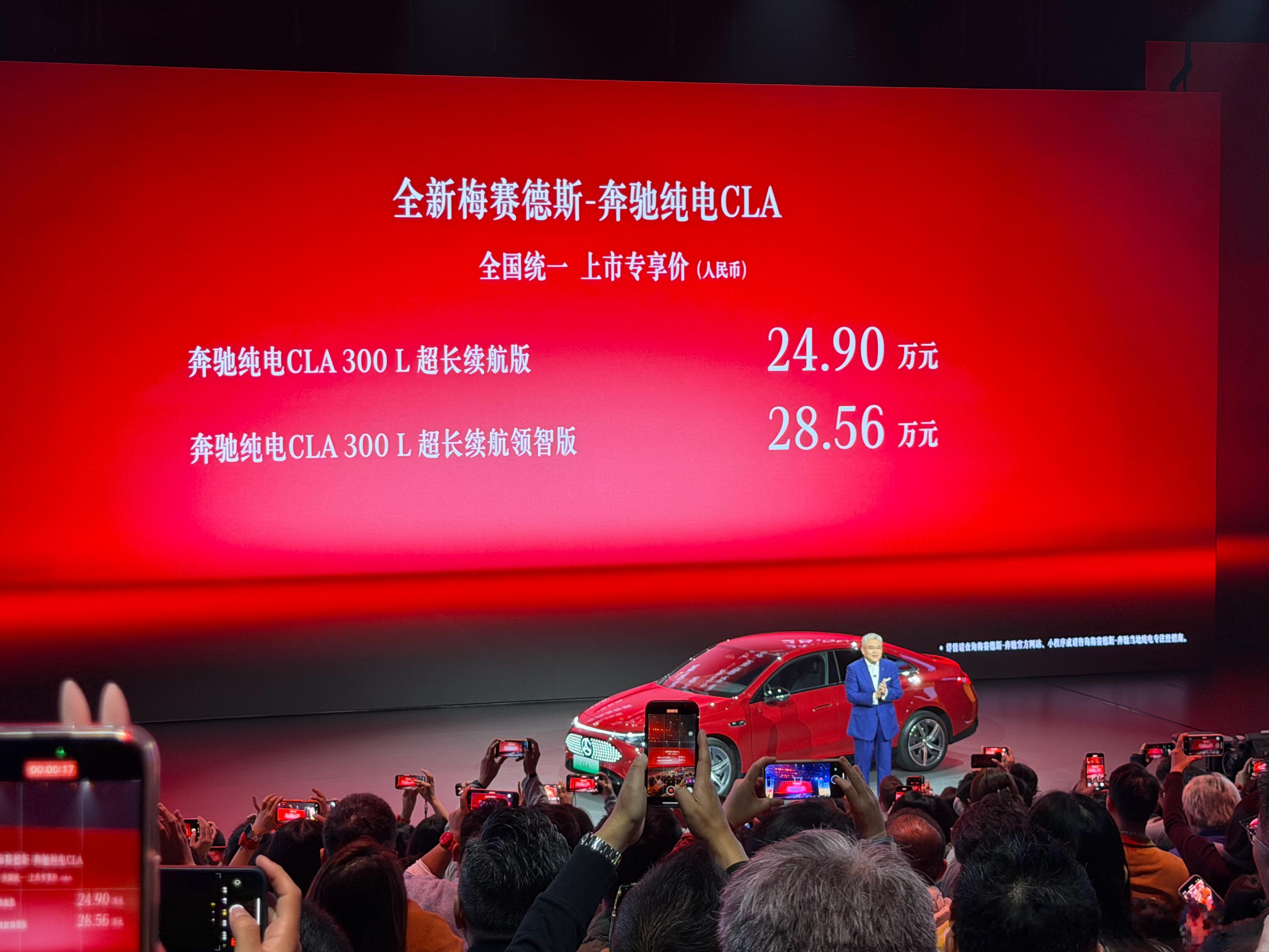全新奔驰纯电cla 发布会玩开了,在脱口秀之后,直接先发布了了价格,大概比预售少了一万块。两个版型,24.90和28.56万!而且,段建军刚才还说了个奔驰一口价,上市八个月内,全国统一,有且仅有一个上市专享价!蟹老板的小报告