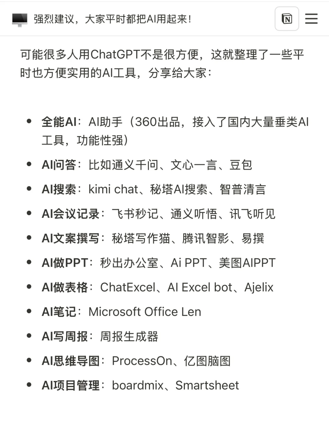 - 全能AI:AI助手(360出品,接入了国内大量垂类AI工具,功能性强)