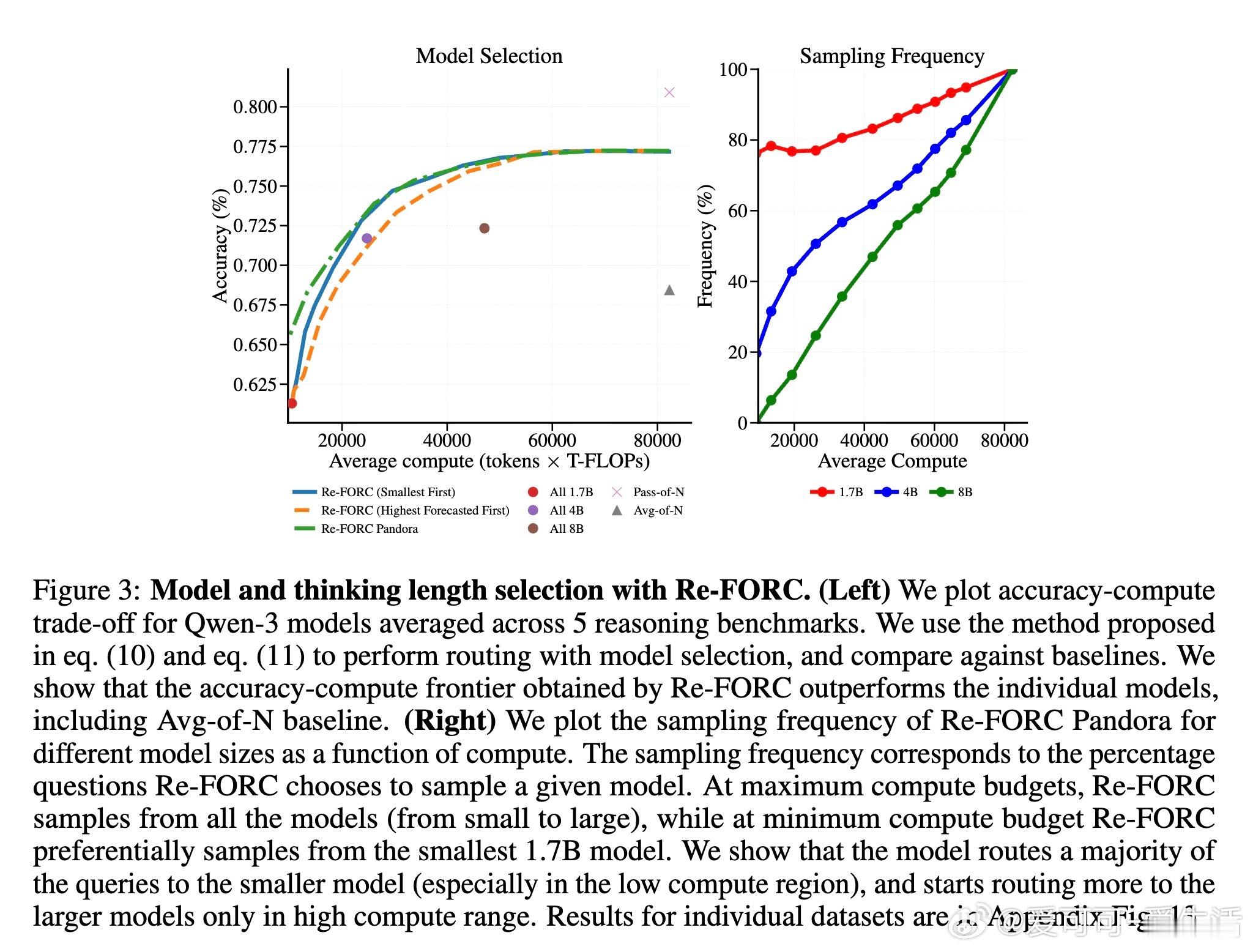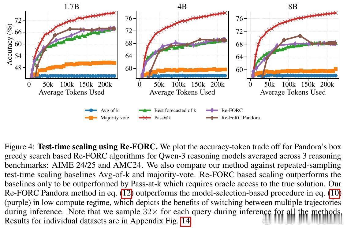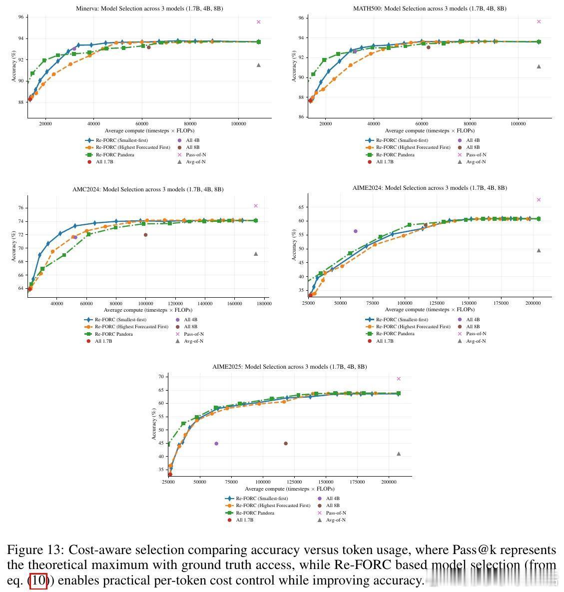 高潮爆发在Re-FORC利用“潘多拉盒子问题”的贪婪搜索算法(Pandora’s Box Greedy Search)上,这是一种基于Gittins指数的决策框架,帮助快速判断是否继续推理或切换模型。实验证明,Re-FORC能在保持准确率的同时,减少26%的计算量;在同等计算预算下,准确率提升4%;或者在保证准确率的前提下,节省55%的计算资源。