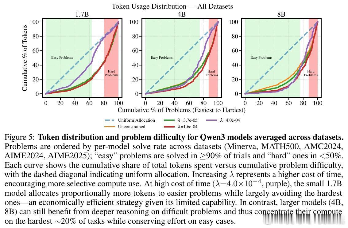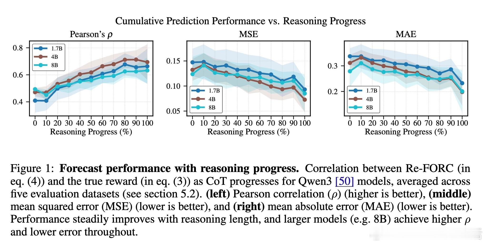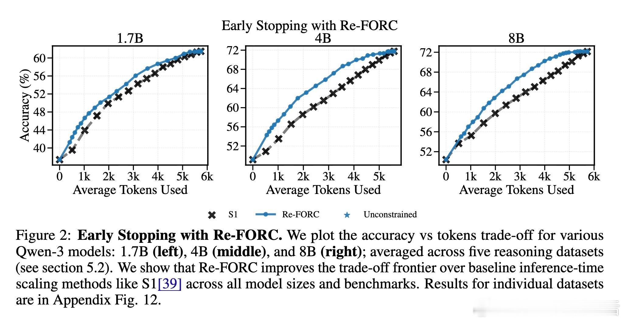 主角是Re-FORC:它不仅预测当前推理状态下,继续生成多少思考token能带来多大收益,还能据此决定是否早停、选择哪个模型更合适,以及如何动态调整推理长度。它通过训练一个轻量级的适配器,附加在已有的推理模型上,实时输出“未来奖励-计算成本”曲线,类似于为推理过程装上了智能的“预判仪”。