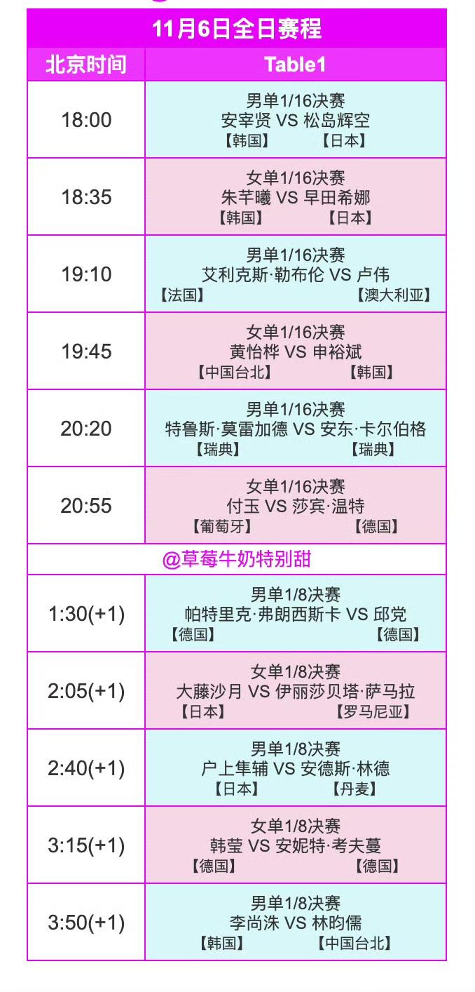 法兰克福站今日(11月6日,周四)赛程抢先看了[笑哭]! 2025WTT冠军赛法兰克福站11月6日全日赛程如下图。 今天晚上六点开始的上半时段比赛还是1/16决赛,下半时段比赛为1/8决赛,明日凌晨一点半开始。 今晚黄金时段有松岛辉空和安宰贤决斗的名场面,还有朱芊曦挑战早田希娜的好戏,还有莫雷加德和安东的大战,好戏连连,不用熬夜,一起关注哦[笑哭]。 (感谢草莓老师的图片)
