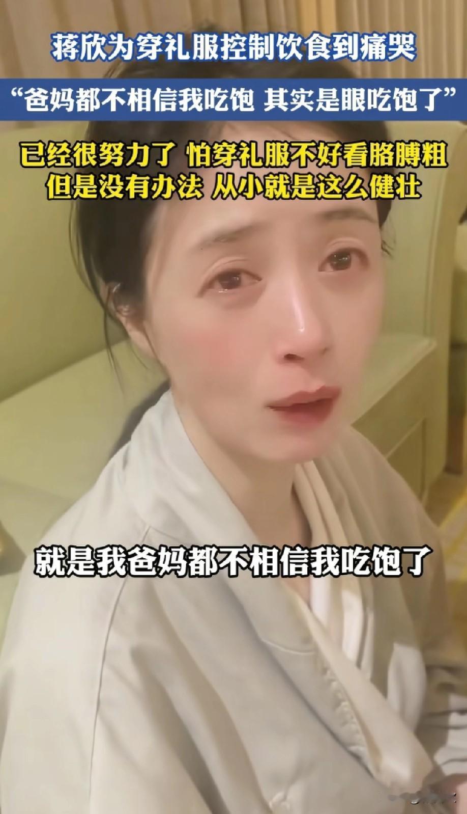 42岁蒋欣深夜痛哭上热搜! 喝着小酒红着眼眶哭诉, 原因却让网友又心疼又想笑。 作为凭“华妃”火遍全网的实力派, 蒋欣的演技从没让人失望, 可171的身高和“大体格子”却成了她的执念。为了上镜好看,她拼到极致, 短短一个月从125斤瘦到90斤, 和爸妈吃饭也只敢吃两口就放下筷子。 视频里的她满脸委屈,破碎感拉满,网友调侃这是首个因“吃不饱”崩溃的明星。但说真的,女明星的审美内卷太离谱了,健康永远该比数字重要, 微胖的她明明更有辨识度更讨喜。 瘦下来的蒋欣确实和关晓彤同框像姐妹,但以节食为代价真的值得吗? 你觉得明星该为了上镜过度减肥吗?
