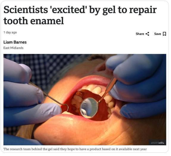 【蛀牙可能很快就会成为历史!科学家们研制出一种可以修复牙釉质的凝胶。】英国研究人员开发出一种凝胶,它能起到支架的作用——保护、强化牙釉质,并使其真正“再生”。科学家们称这项发明为“牙科界的圣杯”。如果一切按计划进行,只需将凝胶涂抹在受损牙齿上即可修复牙齿,无需忍受疼痛或支付昂贵的牙医费用。早期试验已经证明了它的有效性。
