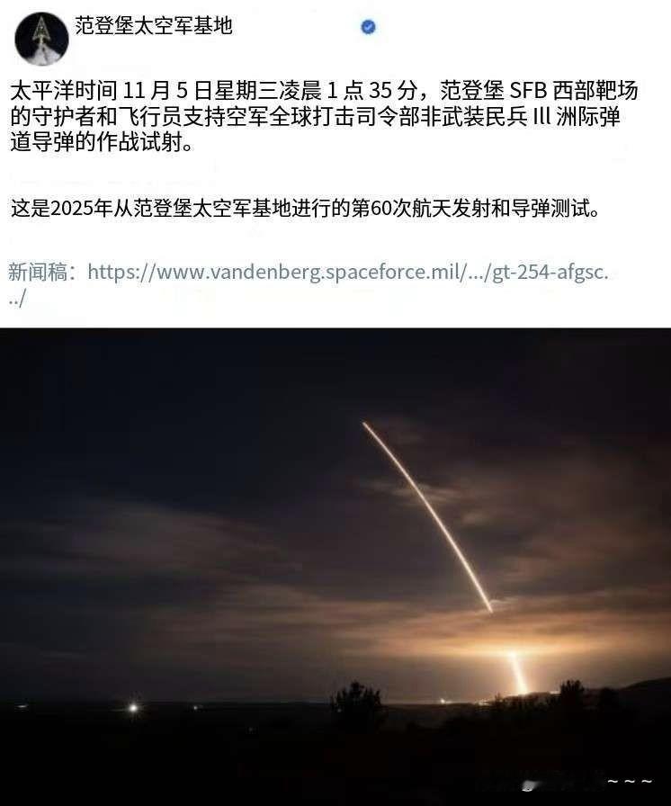 坐不住了? 就在昨天,美范登堡太空军基地发射了一枚“民兵—3”洲际弹道导弹! 发射很成功,达到了美国的预期! 预期是什么? 这是美国在向外界传递美军没有受到没发军饷的影响,一切还处在战备状态吗?证明服役了50多年的导弹还有作战能力的? 据悉,美军现役“民兵—3”洲际导弹约400枚,是唯一的陆基战略核武器。这次测试是准备落实特朗普提出的进行核试验的一部分! 不过,这次发射没有携带弹头!也通知了俄罗斯!