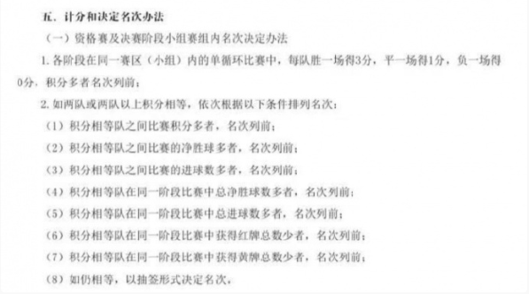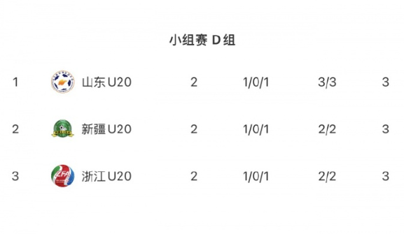 全运会男足U20小组赛D组三队成绩均为1胜1负,山东U20进球最多排名小组第一,而新疆U20和浙江U20进球数、净胜球数、红黄牌数均相同。根据规则,两队将以抽签形式决定出线名额。