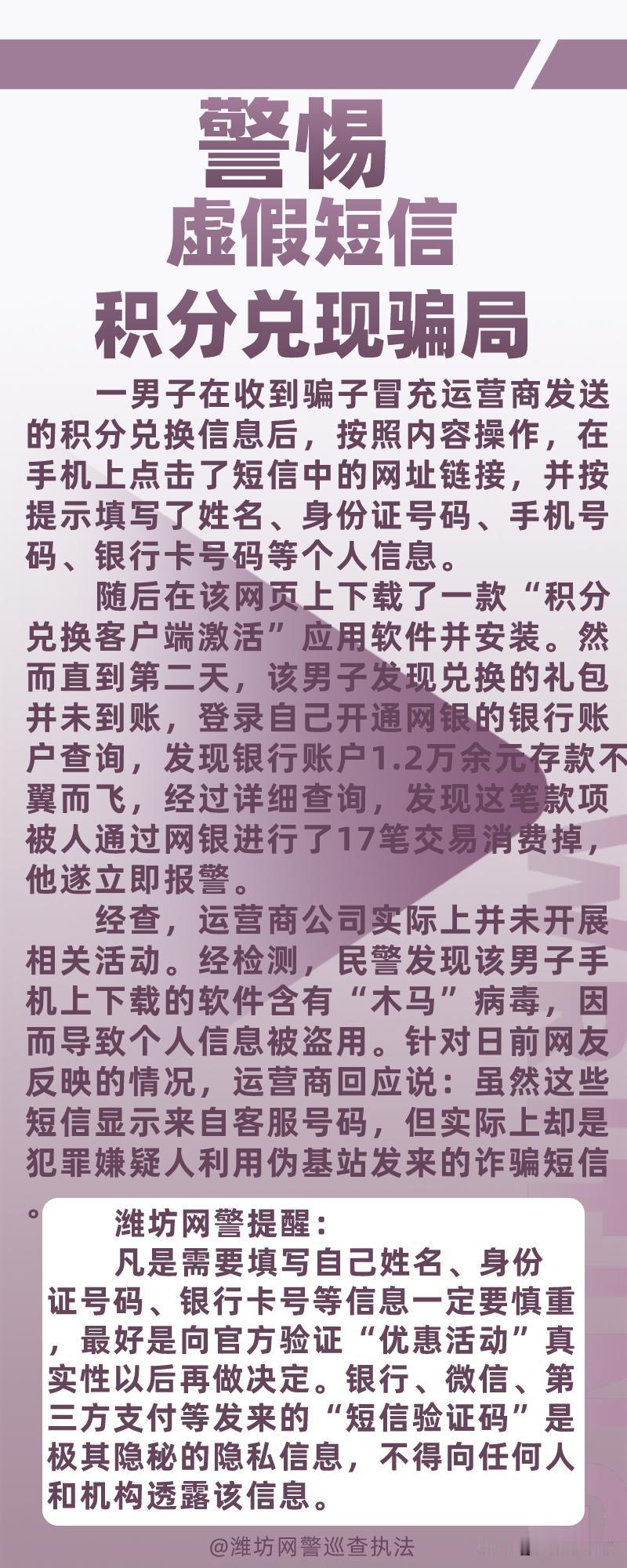 警惕!“10086”发来的短信,可能是骗子的“李鬼”套路 “您的手机号积分即将清零,点击链接兑换手机话费/礼品!”收到这条落款“10086”的短信,你是不是差点点进去?别慌!这大概率是骗子伪装的“李鬼”,专门盯着咱们的钱包下套。 身边不少人都踩过坑。邻居张阿姨前阵子收到“10086”的短信,说她套餐欠费即将停机,让点击链接补缴。阿姨急着用手机,没多想就点了,跟着提示输了手机号、身份证号,还填了银行卡信息和短信验证码。结果没过半小时,银行卡里的2万块钱就被转走了,等她反应过来,骗子早就没了踪影。 其实这些骗子的套路并不复杂,核心就两点:伪装身份+制造恐慌。他们用技术手段把号码改成“10086”,再编出“积分清零”“套餐欠费”“流量超标”“赠送福利”这些让人动心或着急的理由,附上一个看似正规的链接。一旦你点进去,要么是钓鱼网站套取你的个人信息,要么是诱导你下载木马App,偷取手机里的支付密码、验证码。 最让人防不胜防的是,有些骗子还会打电话过来,一口标准的客服腔:“您好,这里是中国移动10086,您的账户存在安全风险,需要您配合验证身份……”很多人一听是“官方客服”,警惕心瞬间就没了,乖乖把信息全说了出去。 为啥这种骗局总能得逞?还不是抓住了咱们的心理:要么贪小便宜想兑换礼品,要么怕停机、怕账户不安全,一着急就乱了阵脚。尤其是中老年人,对智能手机操作不熟练,更容易被骗子的花言巧语蒙骗。 教大家几个接地气的防骗技巧,记牢就能少上当: 第一,官方App查真相。不管收到啥“10086”的通知,先打开中国移动官方App,或者拨打10086官方热线核实,别直接点短信里的链接。 第二,链接别乱点。正规10086的通知,很少让你跳转陌生链接,凡是让你输银行卡号、身份证号、短信验证码的,全是骗子。 第三,遇事别着急。就算真欠费、积分要清零,也不会让你马上操作,先冷静下来,找官方渠道确认,骗子就没机会了。 现在的骗子越来越狡猾,但只要咱们不贪小利、不慌不忙、认准官方渠道,就能让他们无缝可钻。记住:真正的10086,不会随便要你的银行卡密码和验证码;那些催着你“抓紧时间”“过期作废”的,大概率是骗子的圈套。 把这篇文章转给家人朋友,尤其是爸妈长辈,让更多人看清骗子的套路,守住自己的辛苦钱!