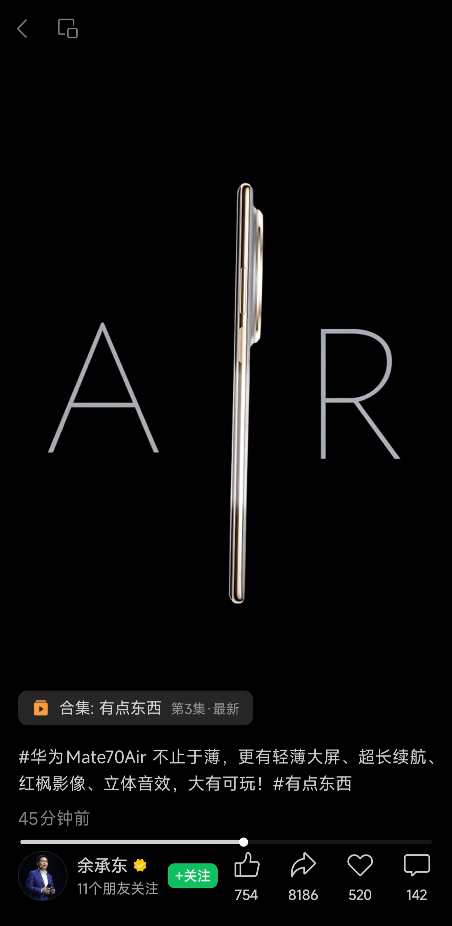 华为Mate70 Air发布,4199元起售7英寸屏幕、208克的重量、6.6m