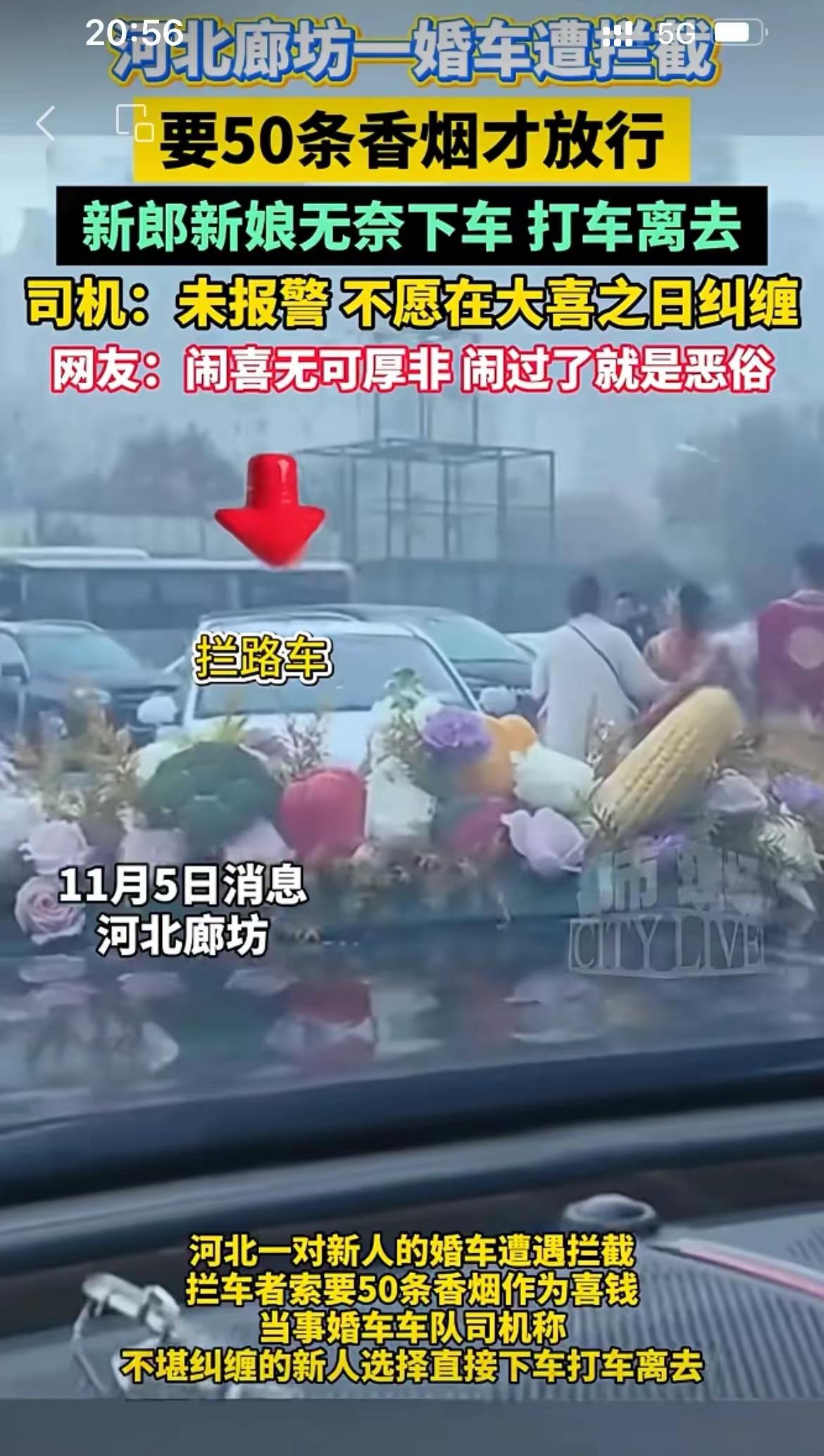 堵路、拦车、不拿出50条香烟不能走。 这几个民俗行为和法律条文中拦路抢劫的认定标准有什么不同? 10月5号,河北一对新人的结婚喜车,被人直接用车堵路拦住,不拿出50条香烟绝不放行。 一对新人谈了半天对方毫不让步,无奈只能打车离开。 说实话,一二盒香烟可以理解为民俗热闹一下,50条香烟就已经是变相的拦路抢劫了。 如果一盒香烟二十元的话,一条就是二百元,五十条就是一万元。 可以查一下,拦路抢劫一万元需要判多少年? 而如果打上了民俗婚闹的外衣,成不成都没事,这才是根源。