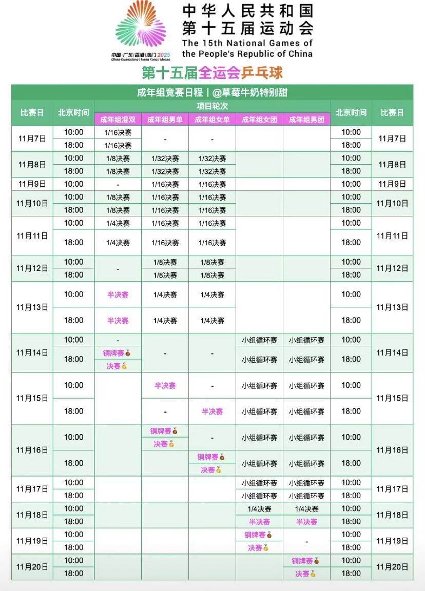 11月7日,全运会乒乓球赛程表,有两场混双可以看 成年组7号有两场混双比赛可以看, 混合双打1/16决赛, 时间分别在中午的12点半,和晚上的8点半。 7号当天完成1/16决赛,6张球台同时开打。 这也意味着全运会已经开始了。 团体单打的签位昨天也出来了, 大家都在认真备战。 加油哦,期待精彩的赛事!