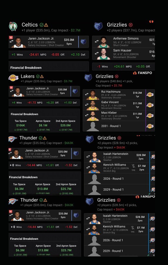当传出灰熊甚至有意把3J都卖掉之后,网友们开始交易模拟了,不过我有一个问题,湖人绿凯我还能理解,为啥雷霆还要交易3J呢?