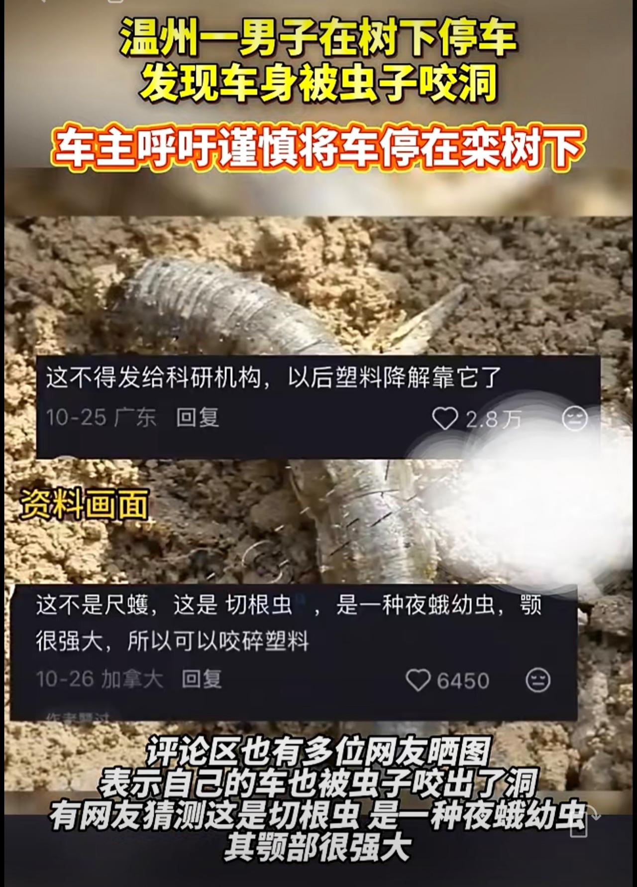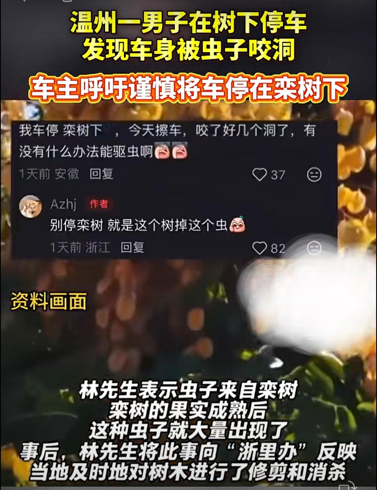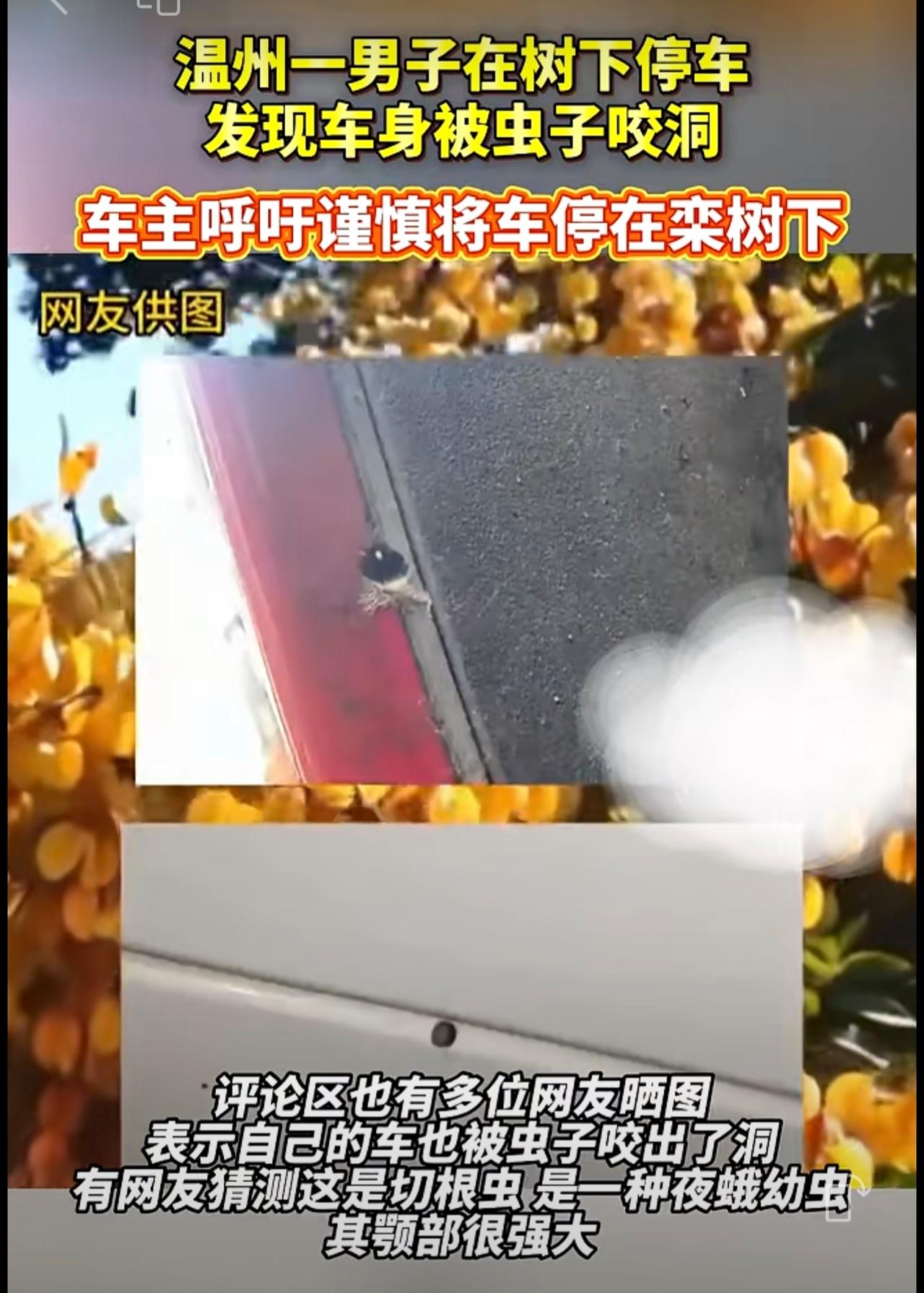 一男子在树下停车发现车身被虫子咬洞,车主呼吁谨慎将车停在栾树下 来源:羊城晚报 温度发布编辑: 周心怡 审核: 彭永棠 监制:吴栋梁 总监制:缪磊