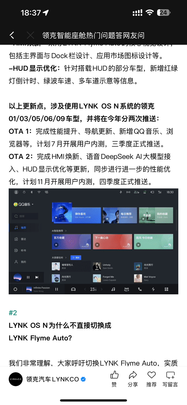 领克09车机是不是真的要更新了 车机一直凑合着用 看看到时候更新怎么样吧 会不会让人失望 尤其语音助手 简直了 还有停音乐的爱趣听 一个月15块 和qq音乐会员还不通用 还有高德地图 那个语音播报