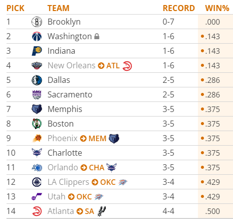 按目前战绩排下来,最新的乐透选秀顺位,老鹰你们加油啊,再多输几场,你们明年有鹈鹕的无保护首轮肯定稳,没必要赢,真的没必要!
