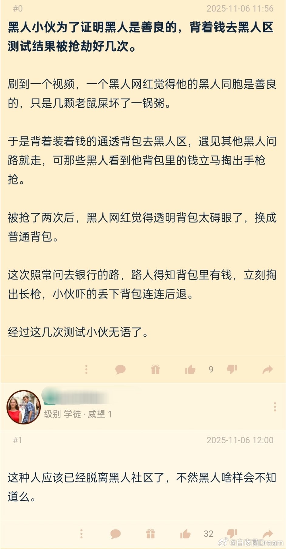 美国黑人小伙为了证明黑人是善良的,背着钱去黑人区测试结果被抢劫好几次。我也看了[允悲]