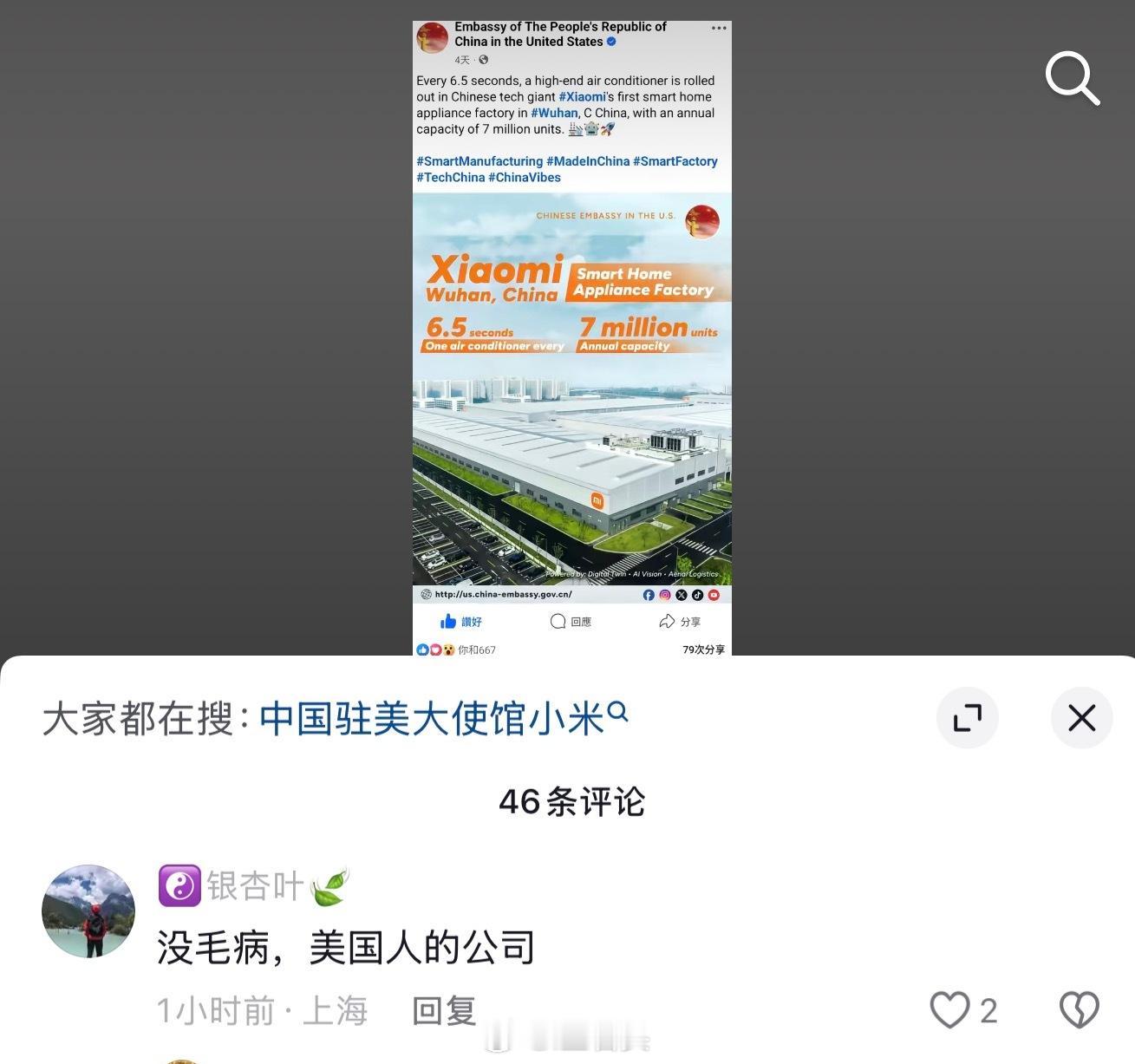中国驻美大使馆发文,点赞小米大家电智能工厂,然后DY上面的老登连这都能喷。[震惊]