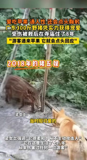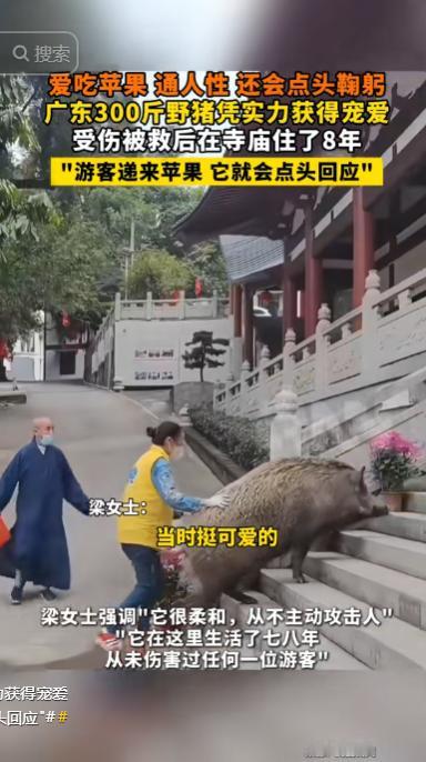 “真成精了?”11月4日,广东江门,一游客去观音寺参拜时,竟看到一头300斤重的野猪躺在地上晒太阳,周围的人也不害怕,甚至还有人上前抚摸它![给你小心心] 原来,这头野猪是寺庙救助的,性情温顺,喂它苹果时还会对着人点头。 在广东江门的观音寺,有一头名叫“猪五妹”的野猪成了游客眼中的明星,它重达300斤,却常在寺旁悠闲晒太阳,甚至允许游客轻轻抚摸,显得格外温顺。 “猪五妹”与寺庙的缘分始于八年前,那时它还小,不幸被捕兽夹夹住后脚,挣扎着来到观音寺附近。 寺里的师父和义工发现后,为它处理伤口,精心照料了一个多月,虽然它最终失去一个后脚趾,走路微跛,但保住了性命。 令人意外的是,康复后它没有返回深山,反而一次次回到寺庙,最终在观音寺后山定居下来。 义工梁女士说,“猪五妹”这个名字取自佛教“五戒”,寓意平和与戒律,尽管体型庞大,它性格却非常温和,从不攻击人。 它最爱吃苹果,游客只要举起苹果说句“恭喜发财”,它就会缓缓点头回应,模样憨厚,不过它也有偏好,遇到不合胃口的食物,会直接用鼻子把饭盆拱翻,让人忍俊不禁。 四川职业技术学院唐利军教授认为,从外形看它很可能是野猪与家猪的杂交后代,天生攻击性较低,再加上长达八年与人类的良性互动,让它逐渐形成亲近人的习惯。 如今“猪五妹”已快九岁,相当于进入老年阶段,它更爱在寺后平台的窝里安静休息,或与一只常相伴的小鸡一起散步,过着平静的“退休”生活。 寺庙在林业部门指导下,也设立了提示牌,提醒游客保持适当距离,文明互动。 当我们用尊重代替驱赶,用共处替代对抗,或许就能找到与自然共生更温暖的方式。 广东江门观音寺的“猪五妹”一被大家熟悉,不少网友的留言那叫一个有趣。 “这哪是野猪啊,这分明是八戒本戒,看来是跟着唐僧取完经,终于找到地方修行了。” “瞧瞧它晒太阳那舒服劲儿,躺平姿势比我都标准,看来寺里的生活是真惬意。” “看着它眯起眼睛点头的样子,心都化了,一个无助的小生命遇到了善良的人,最后选择留下,用八年的陪伴来回报,这简直就是现实版的童话故事。” “万物皆有灵性,善意真的能创造奇迹,猪五妹的存在,就像一座小小的灯塔,提醒着我们,信任和和谐共处是多么美好。” “听说它不爱吃菜叶的时候还会拱翻饭盆?哈哈哈,这挑食的毛病跟我家娃一模一样,也是个有脾气的主儿!” “专家说了,它很可能是野猪和家猪的杂交后代,天性相对温和,再加上这么多年在寺庙里受着善意对待,通人性也就不奇怪啦。” “毕竟野猪的基因还在,体型又这么大,游客们互动时还是得注意安全,遵守寺庙的规定,可千万别因为它温顺就忘了保持安全距离。” 您觉得在生活中,我们还能为身边的野生动物做哪些力所能及的小事,来传递这份善意呢?欢迎在评论区分享您的暖心想法或类似经历! 信息来源:青岛新闻网