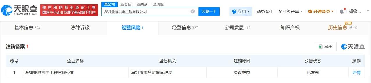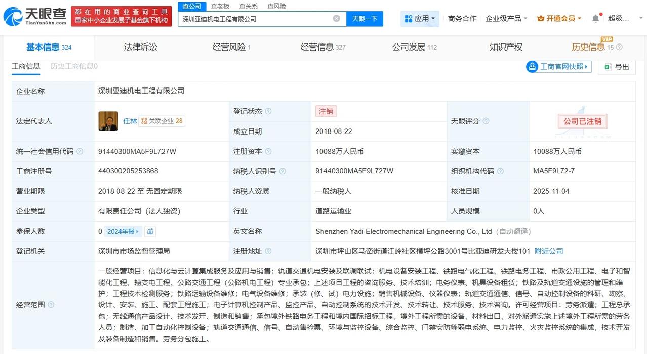比亚迪旗下深圳机电工程公司注销 天眼查工商信息显示,近日,深圳亚迪机电工程有限公司登记状态由存续变更为注销。此前,该公司已发布注销备案公告。 该公司成立于2018年8月,法定代表人为任林,注册资本约1亿人民币,经营范围包括轨道交通机电安装及联调联试、铁路及轨道交通设施的管理和维护等。股权全景穿透图显示,该公司由比亚迪旗下比亚迪通信信号有限公司全资持股。 天眼查信息: