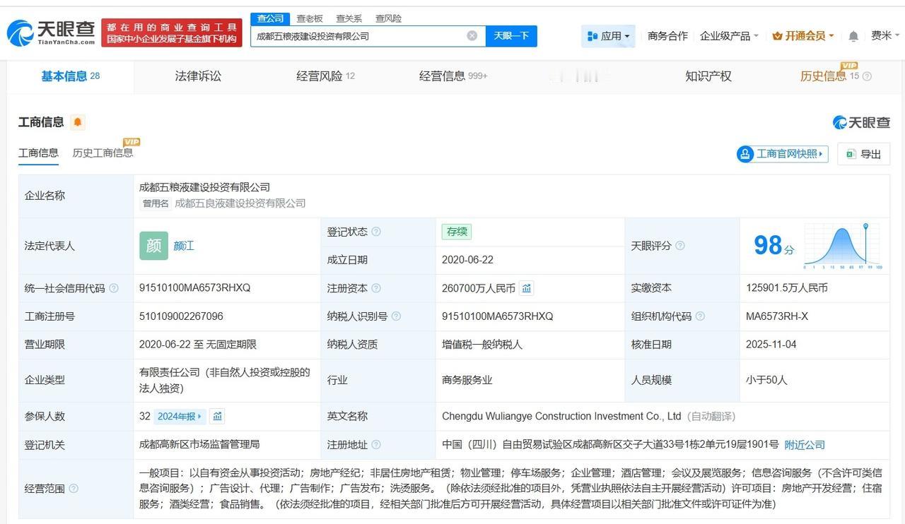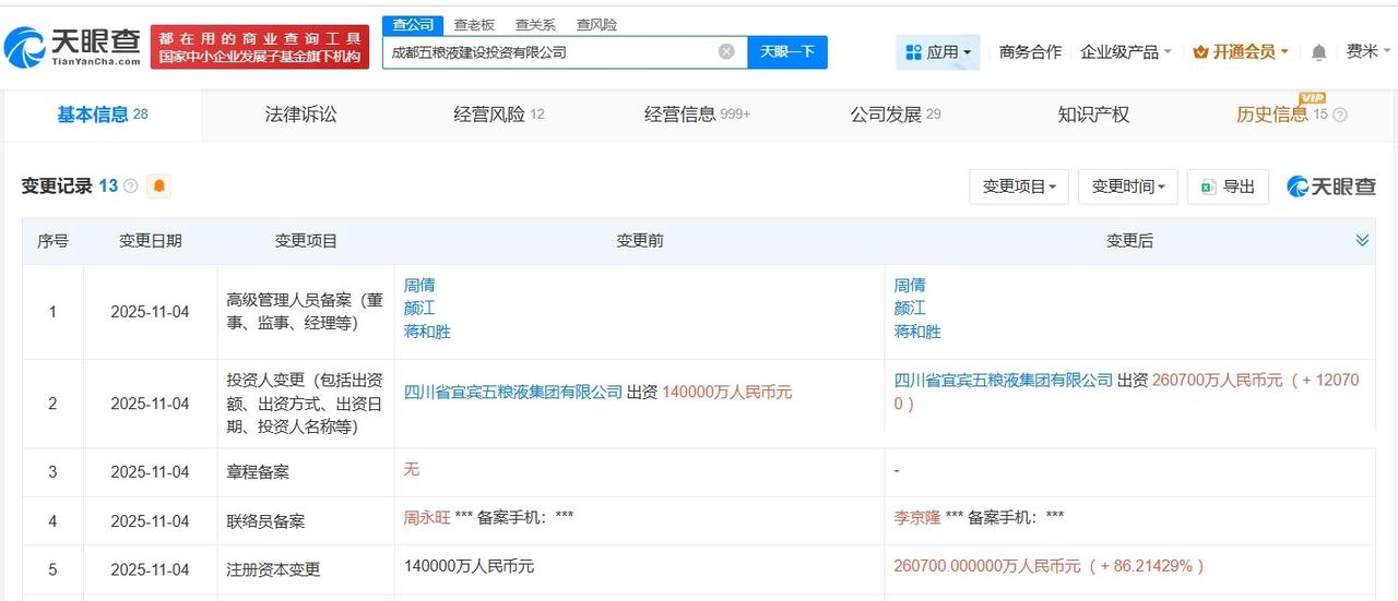 五粮液集团旗下成都建设投资公司增资至26.07亿增幅约86% 天眼查工商信息显示,近日,成都五粮液建设投资有限公司发生工商变更,注册资本由14亿人民币增至26.07亿人民币,增幅约86%。 成都五粮液建设投资有限公司成立于2020年6月,法定代表人为颜江,经营范围包括以自有资金从事投资活动、房地产经纪、非居住房地产租赁等。股东信息显示,该公司由四川省宜宾五粮液集团有限公司全资持股。 天眼查信息: