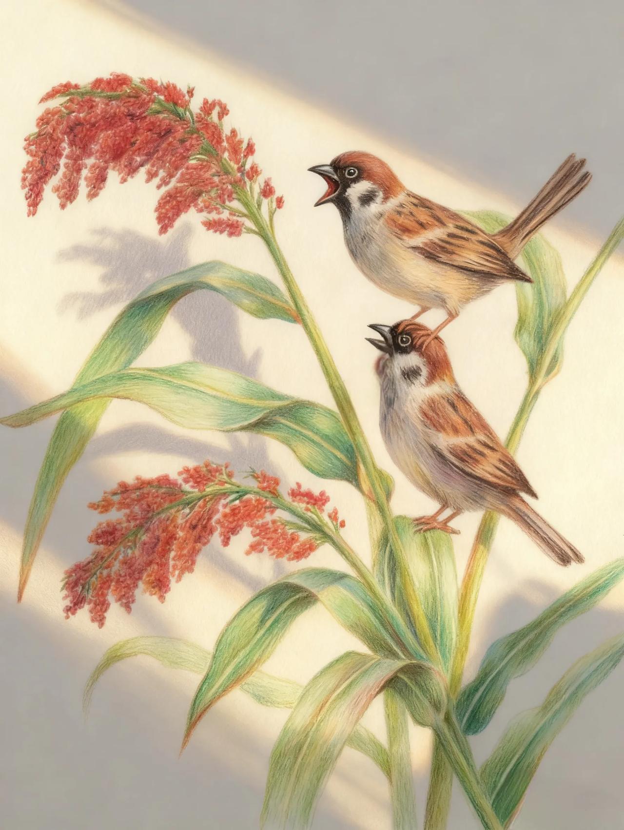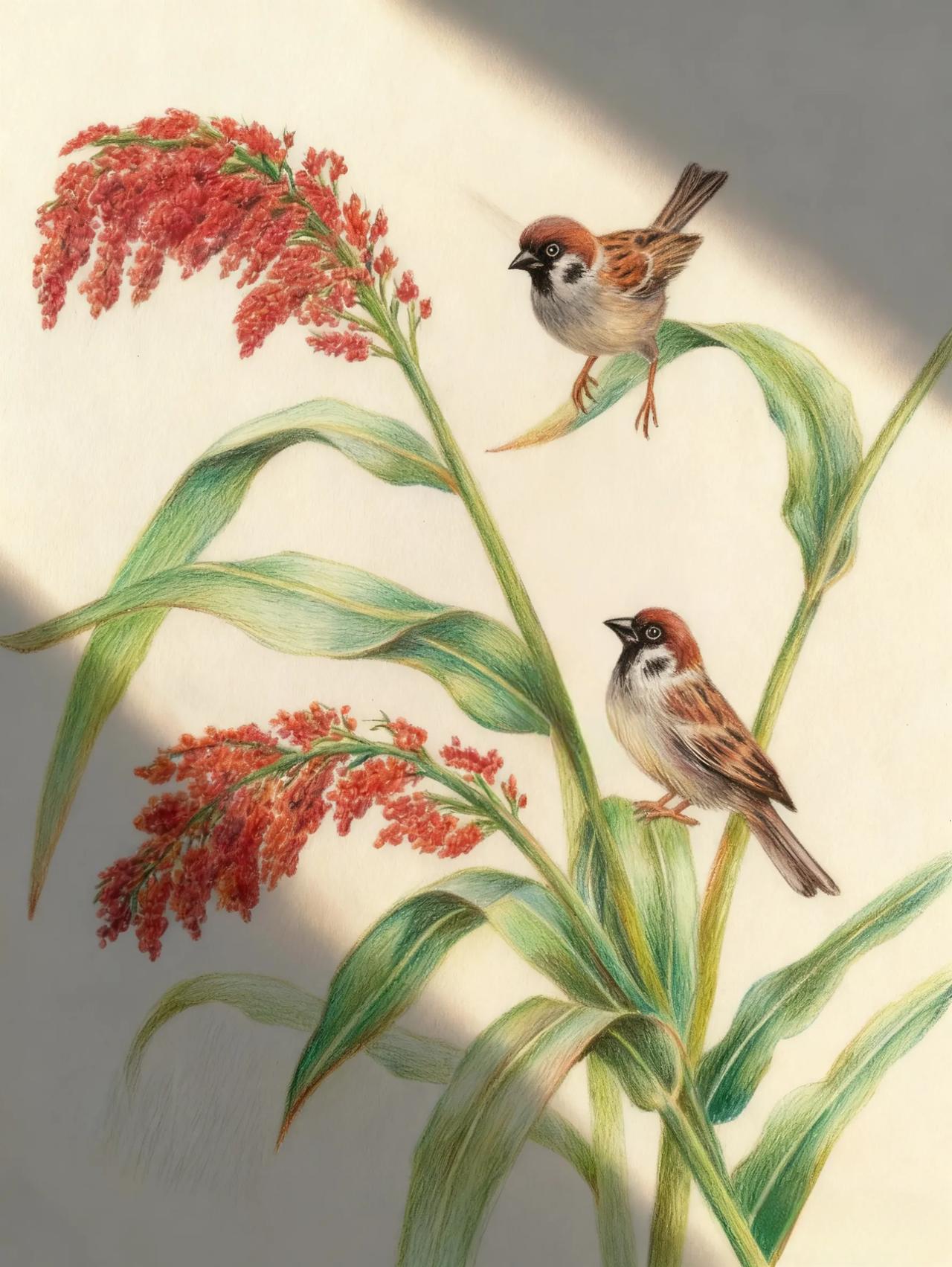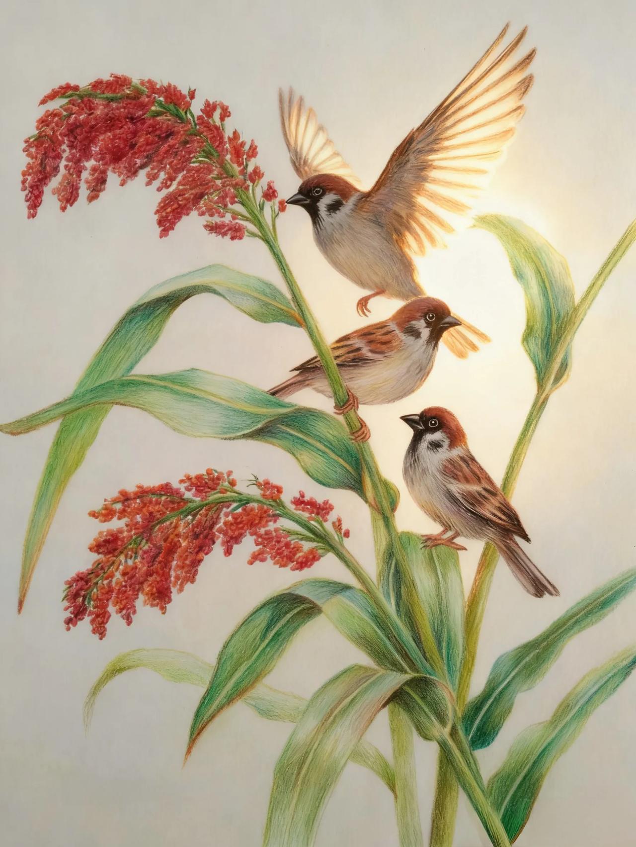 红粱穗攒着秋的艳,雀羽沾了光的软。