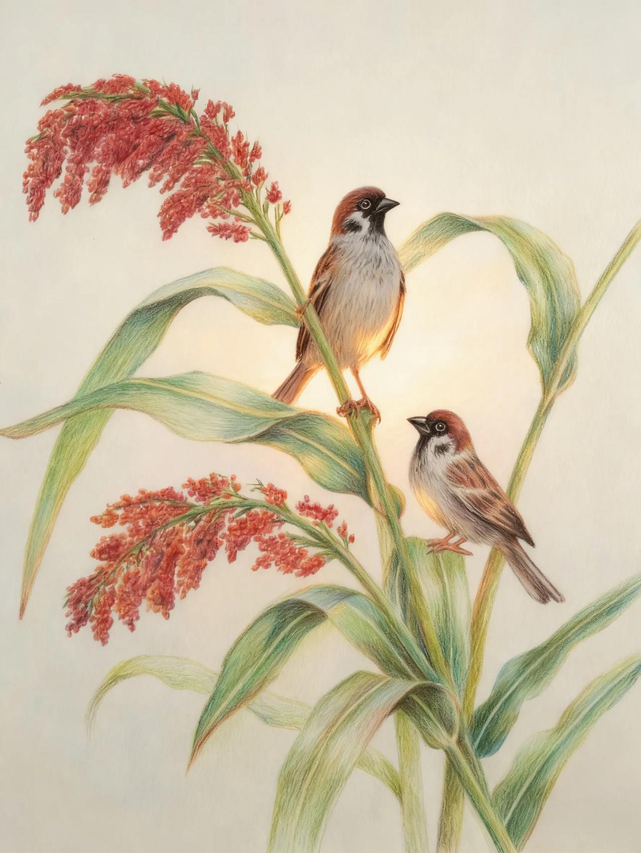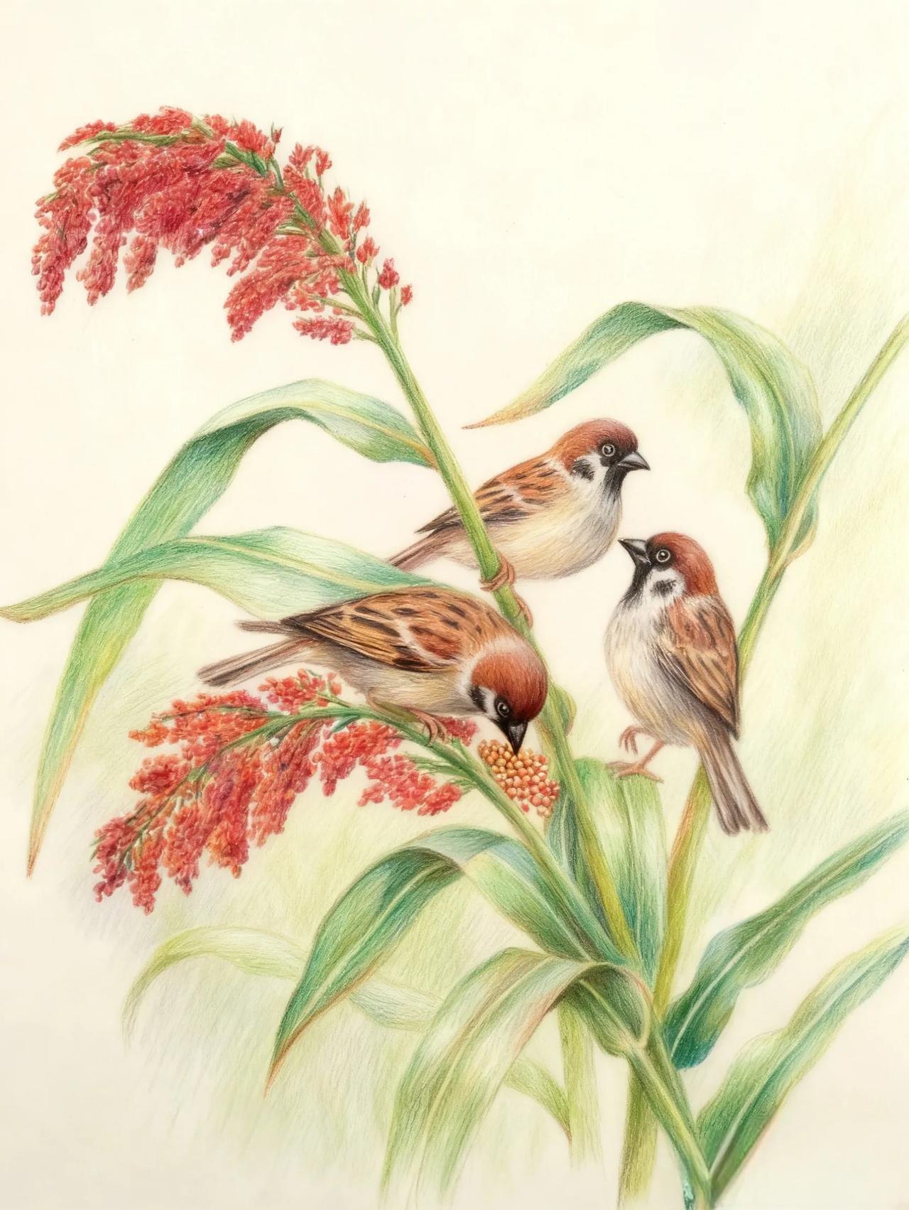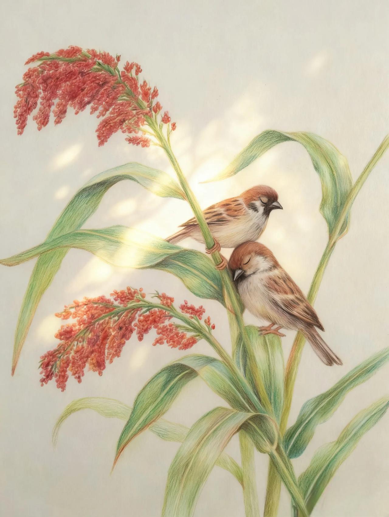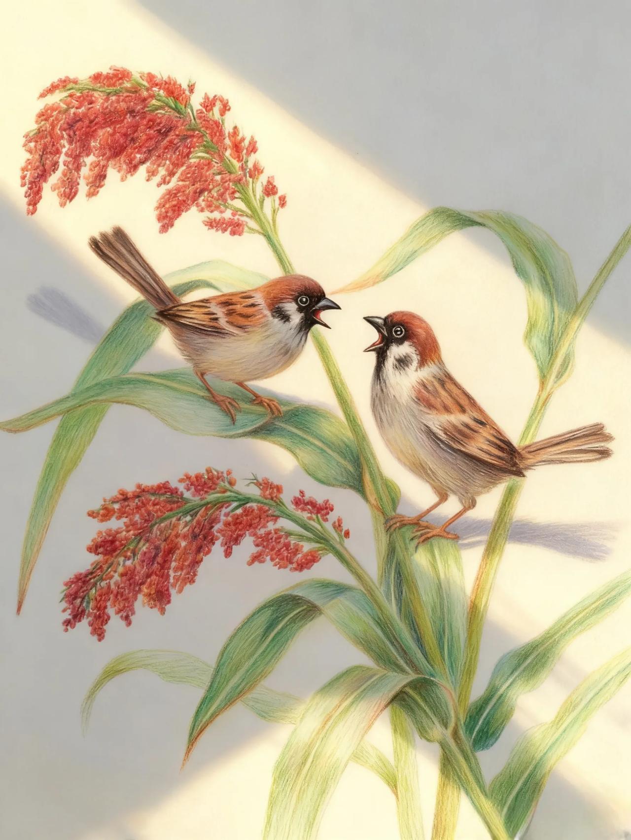 红粱穗攒着秋的艳,雀羽沾了光的软。