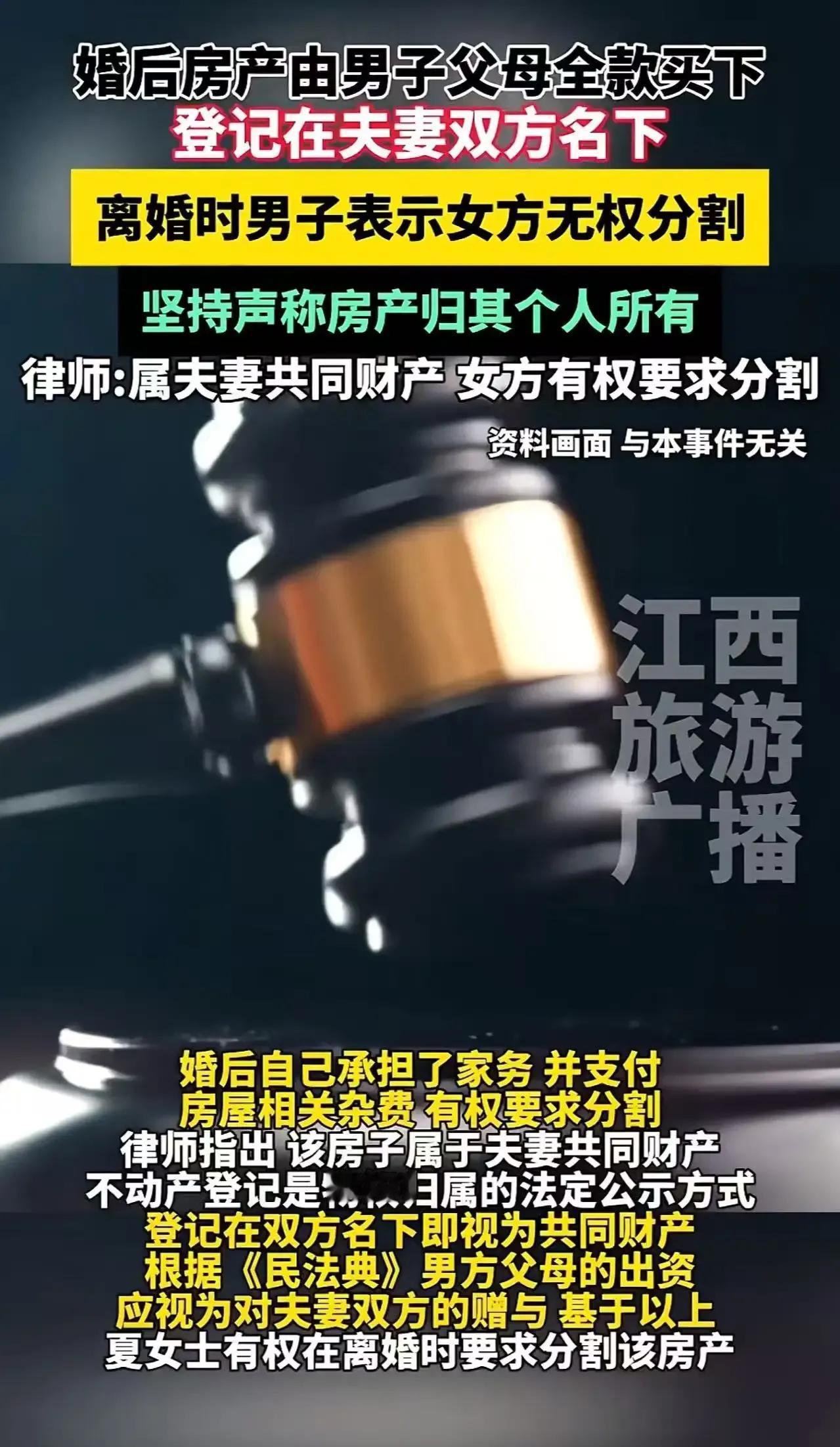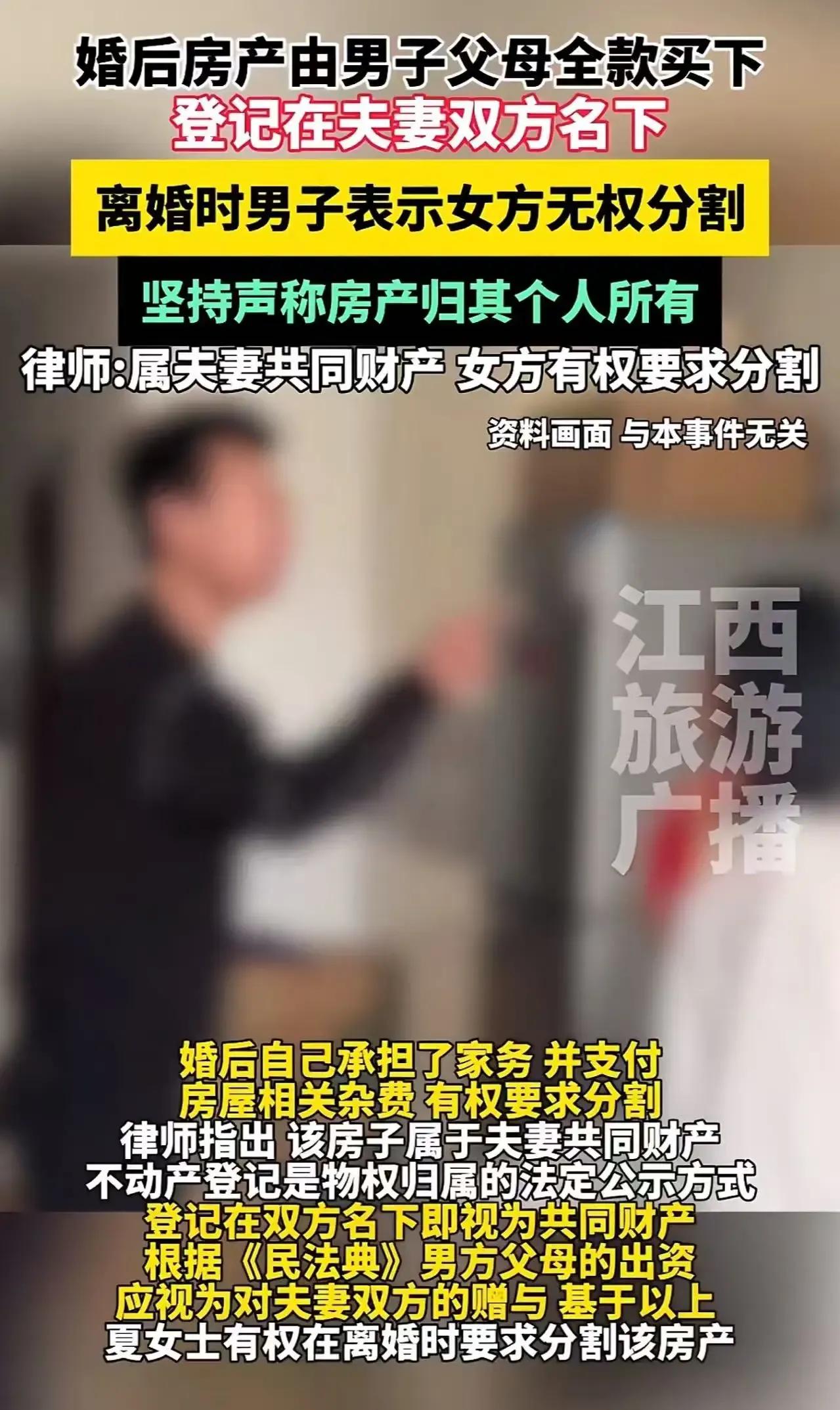 男方父母全款买的婚房,离婚时妻子竟要求分割,这合理吗?男方坚称房子是父母买的,应归自己所有,而妻子则认为婚后自己也有付出,理应分得一份。 在这场离婚房产争夺战中,双方各执一词,互不相让。男方认为,房子是父母全款购买,且明确表示是赠予自己一人的,因此应归自己所有。而妻子则表示,虽然房子是男方父母买的,但婚后自己不仅承担了家务,还支付了房屋的相关杂费,因此自己也有权利分得一份。就在双方争执不下时,有律师给出了专业的解答。律师指出,根据法律规定,不动产登记是物权归属的法定公示方式。也就是说,既然这套房子已经登记在了夫妻双方的名下,那就应当视为夫妻共同财产,双方都有权进行分割。这一解答让网友们炸开了锅,纷纷表示没想到法律上还有这样的规定,看来以后买房时得更加注意产权登记的问题了。 这场离婚房产争夺战,不仅让我们看到了法律的力量,也提醒我们在婚姻中要更加理性地处理财产问题。对于这件事,你怎么看呢?快来评论区留下你的看法吧!夫妻财产新划分 婚姻财产分割