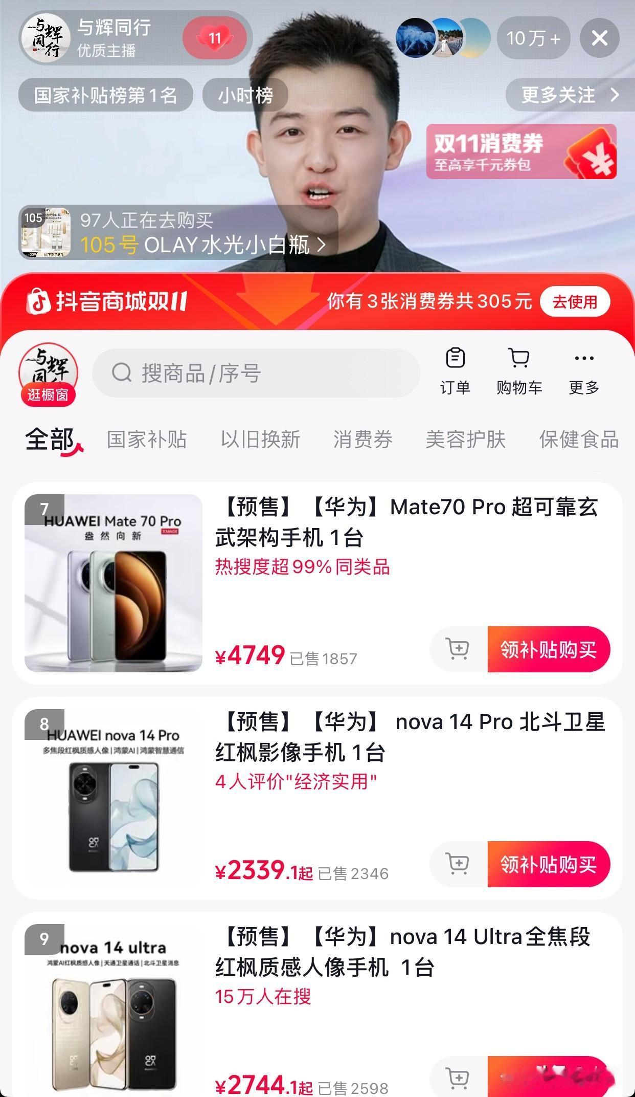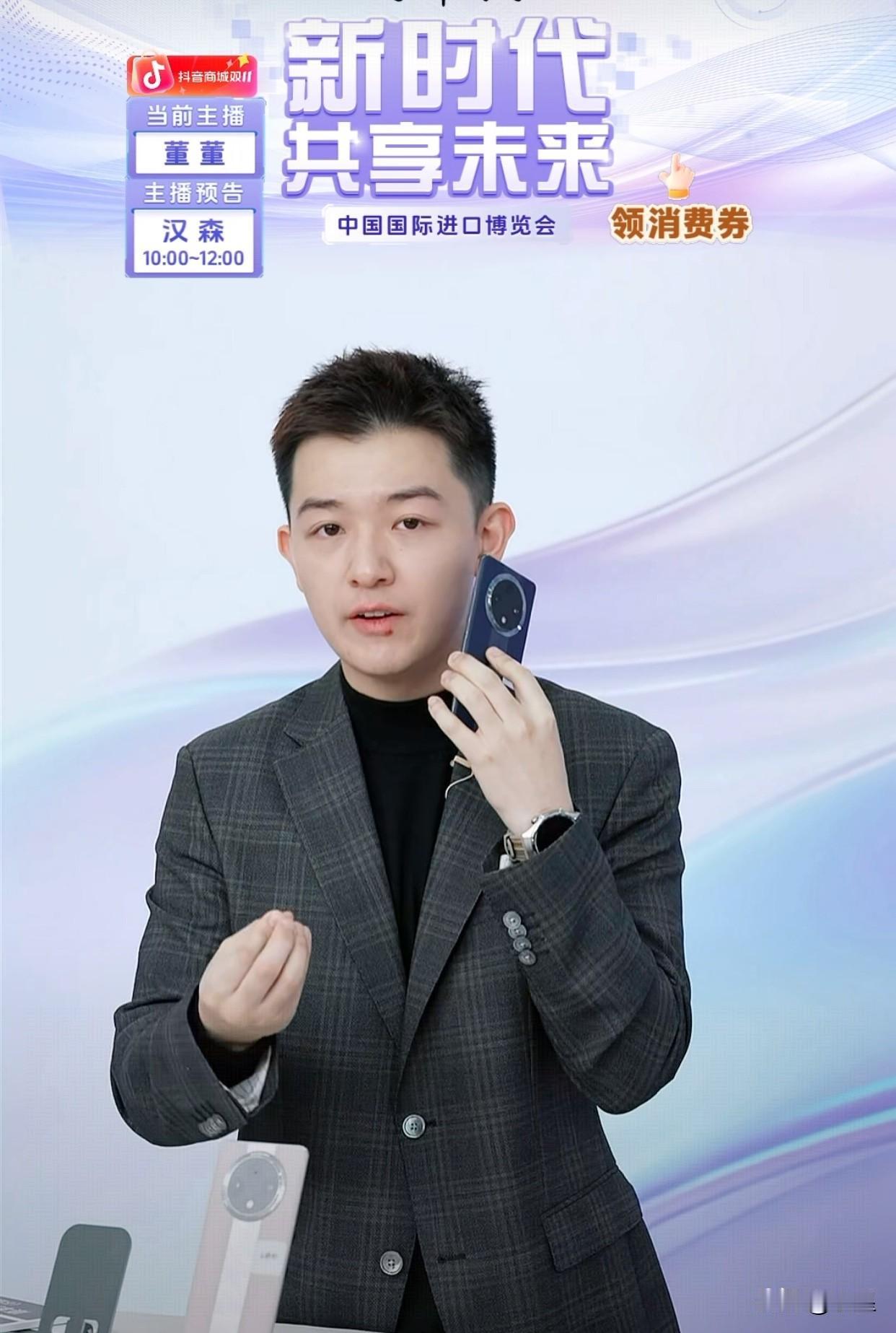 与辉同行在进博会的直播已经开始了 消费者们很热情,大清早在线人数11万人 董董还没讲到华为手机,现货已售罄 目前只有预售了,可以看到优惠力度非常大 主要是数量不是很多,都是每款只有几千台 或许在别的直播间几千台绰绰有余 但在与辉同行那就完全不够抢了 千元手机也有,董董讲的这款才一千一出头 平台券和国补双补的情况下 这优惠力度非常双十一 也不用做数学题,直接减 这一块还是抖音商城够敞亮[耶] 董宇辉的访谈在晚上19点 大家一起期待一下吧[碰拳]