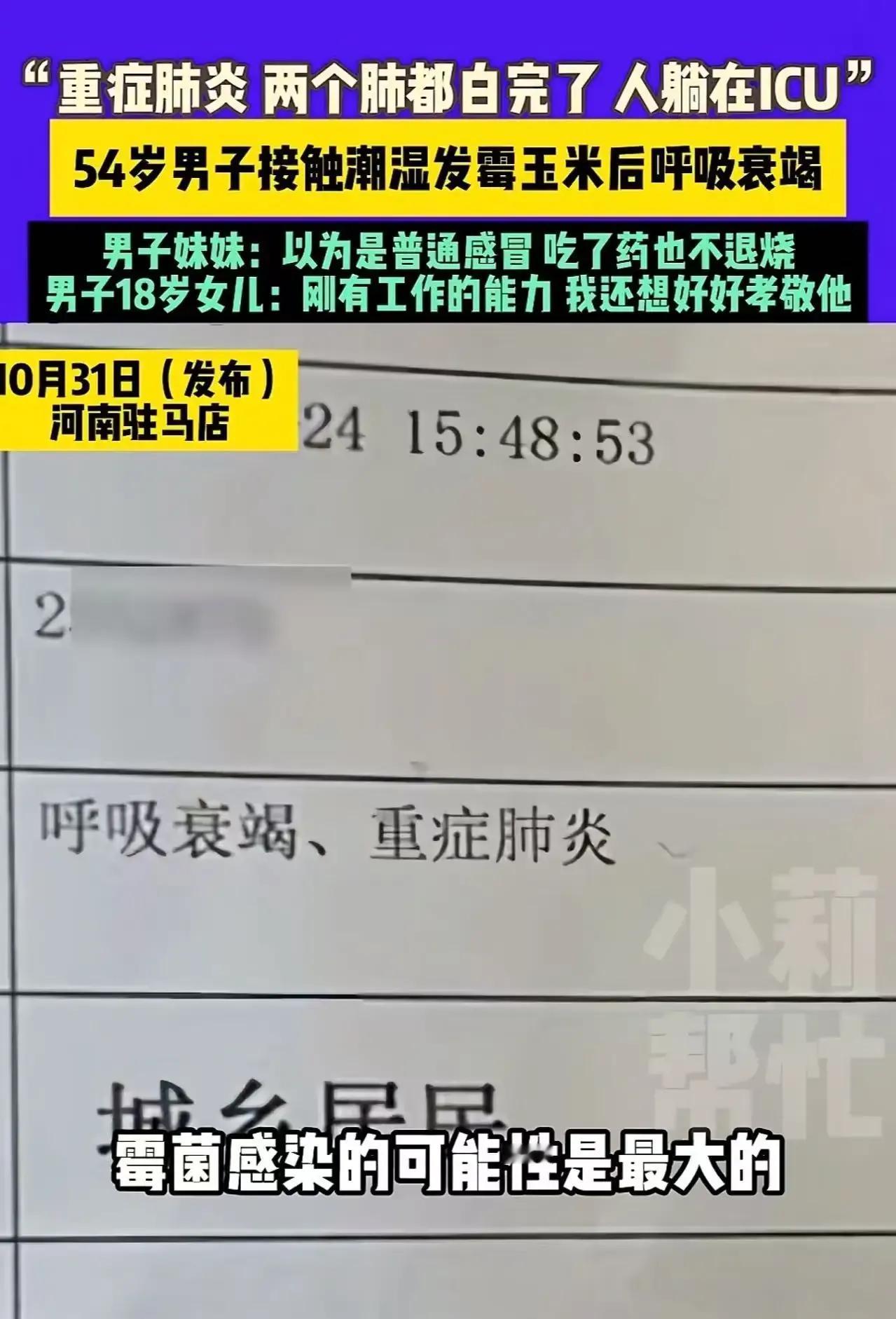 麻绳专挑细处断,厄运专找苦命人!河南驻马店一位54岁的大叔,为了生活辛苦劳作,却因一场小病差点丢了性命,这究竟是怎么回事呢? 这位大叔平时靠机器打玉米为生,那天他像往常一样,用机器处理着潮湿发霉的玉米。谁料晚上就突然发烧咳嗽,身体极度不适。但为了省钱,大叔一直硬扛着,想着挺一挺就过去了。然而,病情却愈发严重,最终大叔倒下,被紧急送入ICU抢救。面对高昂的医药费,大叔心如刀绞,他含泪说:“我不治了,万一治不好浪费钱,还不如把钱留给孩子!”这句话让在场的所有人都为之动容。可大叔的女儿却不愿放弃这唯一的父亲,她坚定地表示,哪怕倾家荡产,也要救回父亲的生命。这场与死神的较量,不仅考验着大叔的意志,更考验着这个家庭的凝聚力。 生活虽苦,但亲情无价。希望大叔能挺过这一关,也祝愿这个家庭能早日走出阴霾。大家对此有什么看法呢?欢迎在评论区留言讨论,一起为大叔加油打气!一生的苦命人 工地苦命人 这就是苦命人生