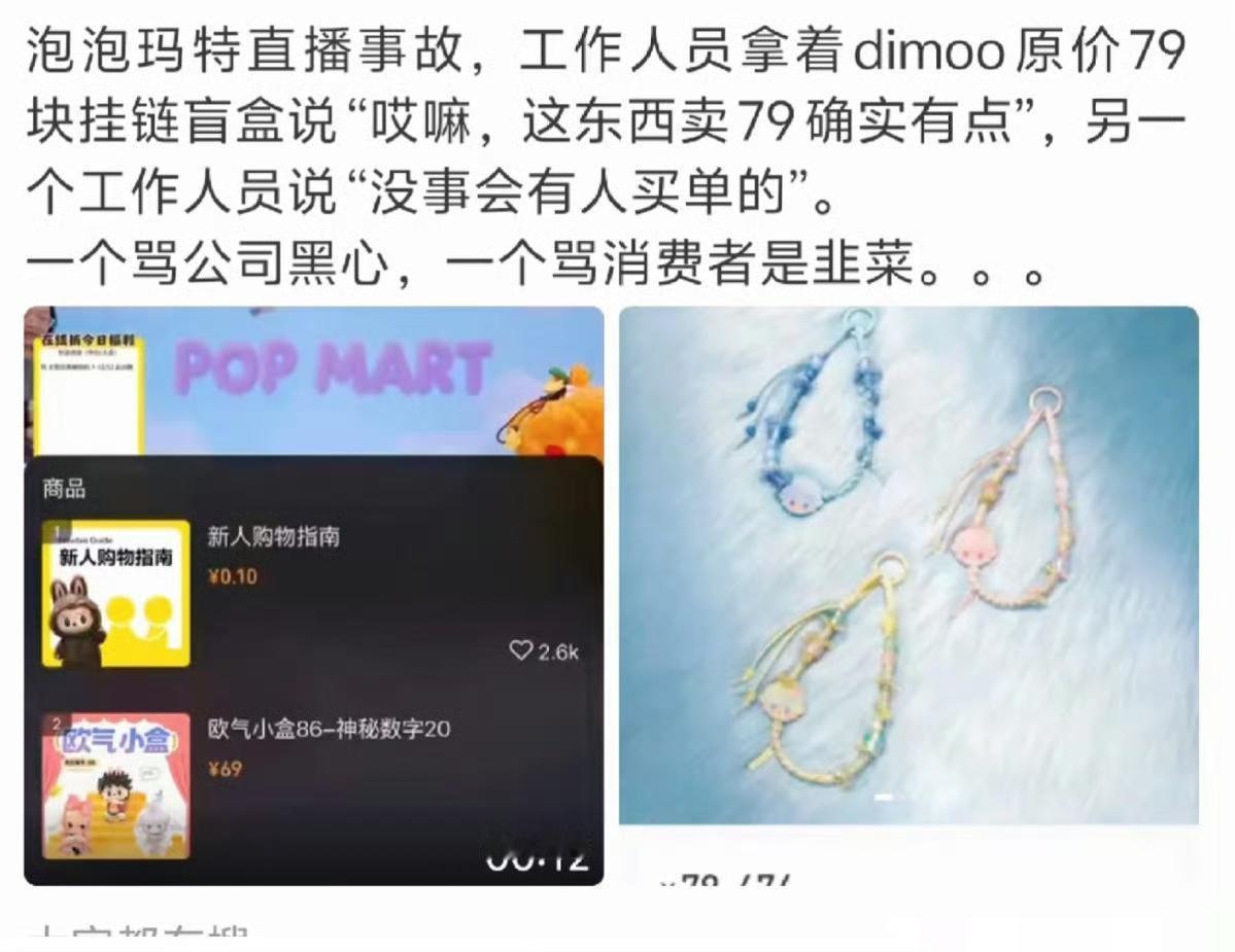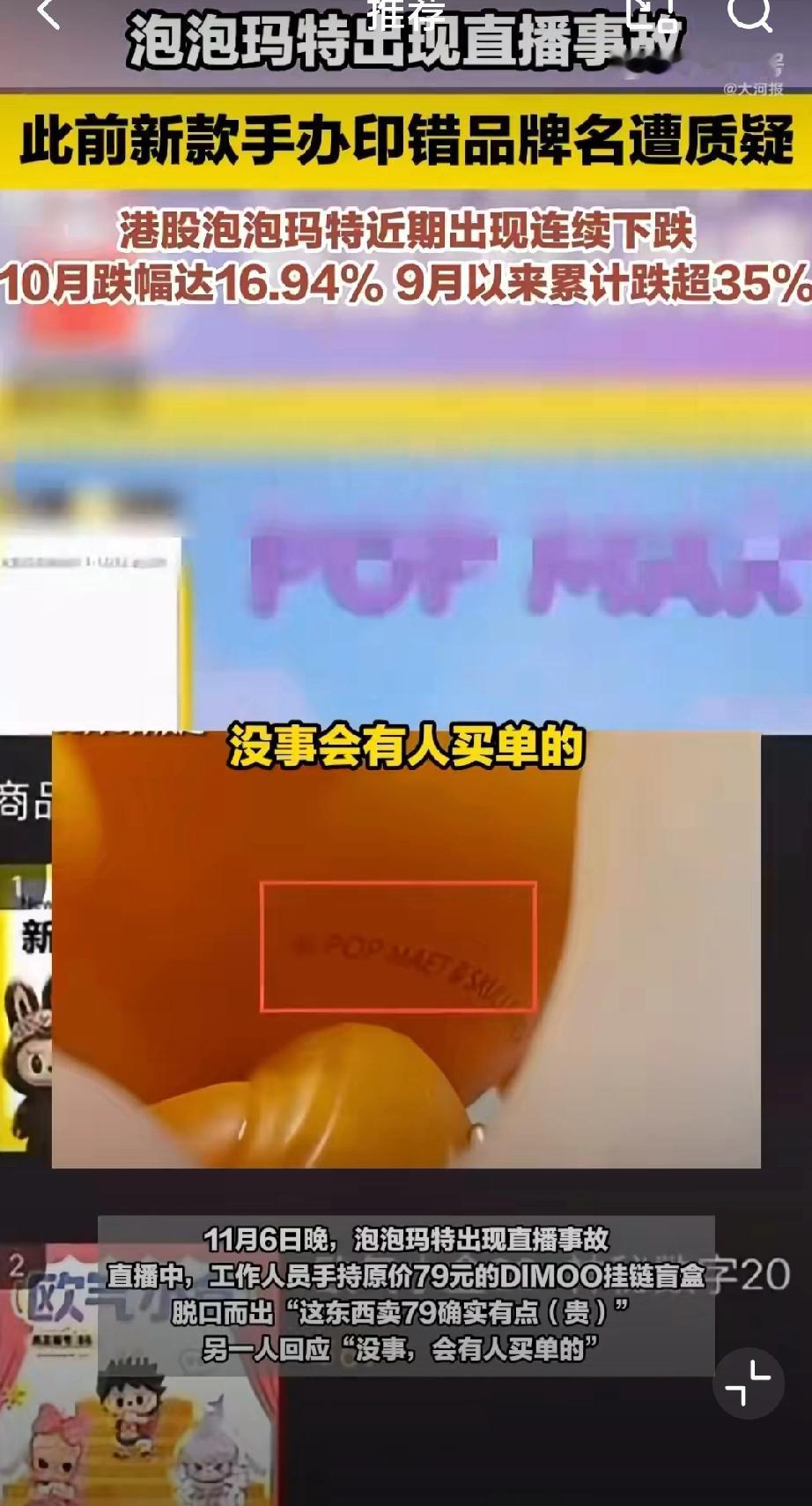 泡泡玛特直播时,一工作人员拿着挂链盲盒说,“哎呀,这东西卖79确实有点…”另一个工作人员接着说,“没事,会有人买单的”… 这的确是“直播事故”了,一个在贬低公司产品的价值,另一个有把消费者当韭菜傲慢之嫌~ 泡泡玛特创建品牌不易,若是一直依赖“总会有人买单”的傲慢逻辑,恐怕在潮玩转型的浪潮中失去先机。泡泡玛特 泡泡玛特市值 泡泡玛特营收