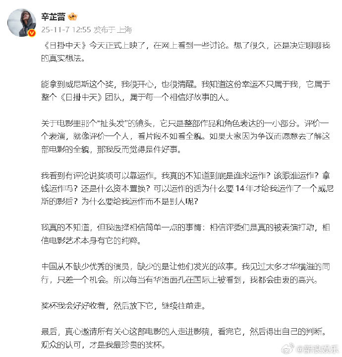 辛芷蕾回应奖项运作争议辛芷蕾回应日掛中天争议 7日,发长文回应新片《日掛中天》争议,她表示电影中“扯头发”的镜头只是一小部分,希望大家去了解全貌。关于“奖项运作”争议,她说:“我真的不知道到底是谁来运作?该跟谁运作?拿钱运作吗?还是什么资本置换?可以运作的话为什么要14年才给我运作了一个威尼斯的影后?为什么要给我运作而不是别人呢?” 最后,她说:“奖杯我会好好收着,然后放下它,继续往前走。”