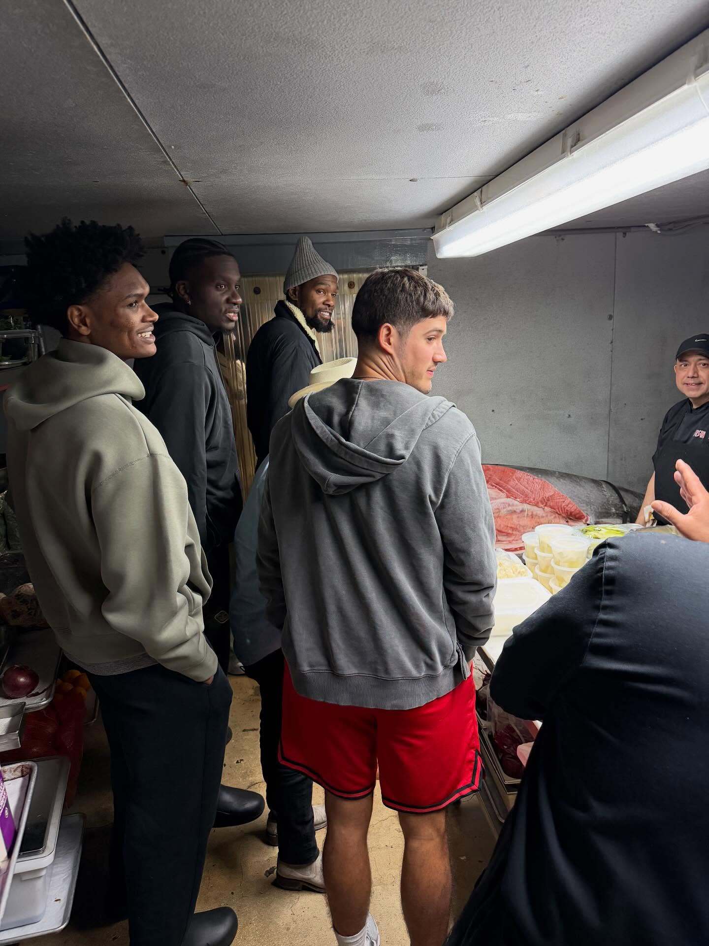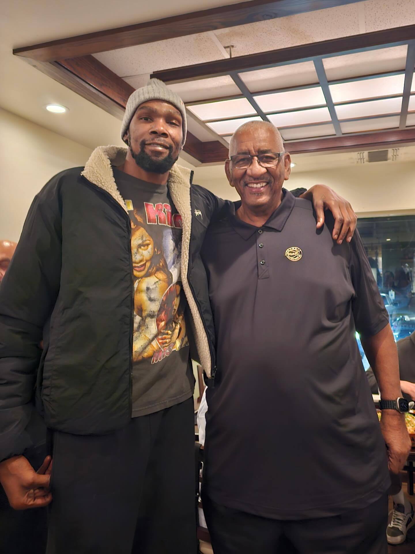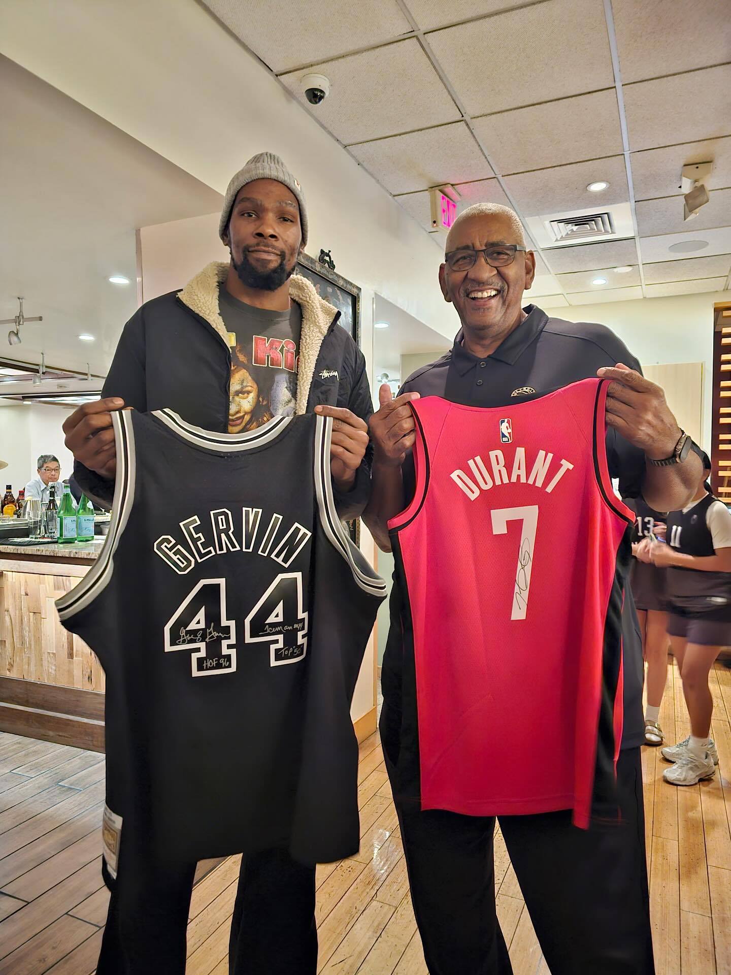 你杜和“冰人”乔治格文互换签名球衣。看上去大伙都去了,餐厅聚餐。你杜还是吃得下饭
