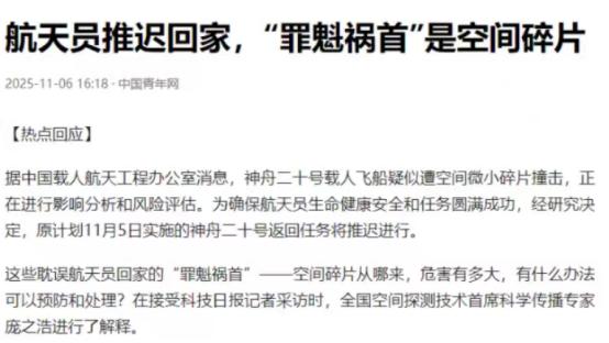 估计现在最让人担心的,就是神舟二十号的航天员,不是因为他们没有成功交接,也不是因为他们没有圆满完成任务,而是因为他们在返回的过程中出现了意外情况。 11月5号中国载人航天工程办公室直接发了消息,神舟二十号疑似被空间微小碎片撞了,原计划当天的返回任务只能推迟,全国等着看航天员回家的人们,心里一下就悬了起来。 大家悬心不是没道理的,这三位航天员陈冬、陈中瑞、王杰,已经在太空待了快七个月。 他们4月24号坐着长征火箭上去的,11月4号刚跟神舟二十一号乘组办完交接,连空间站的“钥匙”都交出去了,就等着第二天回家。谁能想到,临门一脚出了这档子事。 好在官方很快说了,航天员乘组状态都挺好,这点让不少人松了口气。但大家伙儿还是好奇,那撞上来的“小东西”到底是啥,威力真有那么大? 全国空间探测技术首席科学传播专家庞之浩解释了,这些玩意儿叫空间碎片,说白了就是太空垃圾。 这些太空垃圾里,40%以上都是报废的卫星、火箭残骸这些大家伙,剩下的还有发射时丢的螺栓、卫星上掉的涂层碎片,甚至航天员出舱遗落的工具。 更麻烦的是航天器碰撞爆炸产生的次生碎片,碰一次就多一批,跟多米诺骨牌似的,能形成“碎片雪崩”。 别瞅着碎片小,破坏力可不含糊。它们飞起来速度吓人,每秒能到7到10公里,比子弹快好几倍。毫米级的碎片就能把飞船舷窗划花,让太阳翼供电效率下降。 要是厘米级的,直接能戳穿飞船外壳,打穿燃料箱或者管线,搞不好就会泄漏甚至爆炸。就算没穿透,撞击的冲击波也能震坏里面的精密仪器,导航、通信系统都可能失灵。 其实神舟二十号乘组在太空时,就跟空间碎片打过交道。7月份他们出舱作业,还专门给空间站装了空间碎片防护装置。算上他们这次,中国航天员已经在空间站外面装了7次防护“铠甲”了。这些铠甲是多层复合结构,有高强度金属壳,还有能吸收能量的缓冲层,关键部位防护等级特别高。 更关键的是咱们地面有一套完整的监测系统盯着这些太空垃圾。光学望远镜能抓碎片反射的太阳光,连10微米以上的微小碎片都能看清。雷达更厉害,全天候都能工作,能测出厘米级的精度,美国的空间监视网络靠这能找到10厘米以上的碎片。 更何况近些年还加了新技术,激光雷达能实时更新碎片位置,就算晚上或者天气不好也能用。多传感器融合技术能把雷达、光学的数据拼起来,生成3D碎片分布图,碰撞风险算得更准,还能减少虚警。 现在地面团队正忙着给神舟二十号做全面“体检”,分析撞击的影响。这种推迟返回不是第一次,之前神舟十九号就因为东风着陆场天气不好推迟过,团队都有预案。对付不同碎片有不同办法,10厘米以上的能主动调轨道躲开,小碎片就靠被动防护扛着。科学家还在研究用激光烧蚀、太空拖网这些招清除碎片。 地球轨道上现在麻烦大了,1厘米以上的危险碎片估计超百万个,能持续追踪的大碎片都有4.4万个。中国空间站之前就多次主动避险,神舟十七号乘组还修过被微小颗粒撞坏的太阳翼。不过咱们的飞船设计有兜底,像柔性太阳翼是模块化的,坏一片不影响整体供电。 航天员在舱里也不会闲着,他们会配合地面做检查,比如测试电路、监测热控系统,万一真有受损的地方,能在地面指导下加固或者换零件。大家不用太焦虑,地面团队肯定会把风险都排查清楚,才会让航天员出发回家。毕竟对航天工程来说,航天员的安全永远是第一位的。 来源:中国青年网 【航天员推迟回家,“罪魁祸首”是空间碎片】