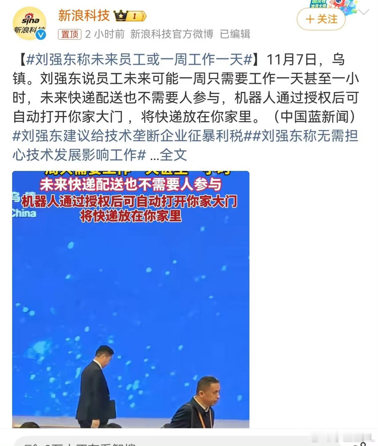 听说了吗?刘强东在乌镇互联网大会上又放“大招”了!他说未来咱们员工可能一周只上一天班,甚至一小时就够了,你家的快递还会被机器人“悄无声息”地送进家门!这话一出,现场先是安静了两秒,接着讨论声就炸开了锅。 东哥这次是时隔8年重回乌镇大会,气场一点没减。他可不是光画大饼,京东在北京的分拣中心已经用机器人替代了90%的人力,明年4月还要搞出全球首个全无人配送站——就是个圆筒建筑,无人机在顶上起起落落,无人小车在下面跑,机械臂在里面自动装货,整个流程一个人都没有。就连最后一步进家门的问题他都想好了:现在全国一半门锁是智能锁,估计五年后90%都是,机器人通过你授权就能安全开门放包裹。 说实话,刚听到“一周工作一天”时,我心里咯噔一下:活儿都让机器人干了,我们干啥去?饭碗会不会丢?但东哥接下来 so 自然地把话圆了回来。他说,首先政府可以立法缩短工作时间,其次会产生大量新需求,比如艺术、旅游、探索世界——他认为五年内全球旅游市场会涨十倍。更重要的是,他抛出一个挺炸的建议:向靠技术垄断赚暴利的企业征收最高90%的“暴利税”,用来反哺养老、教育,让技术红利大家分。这样一来,逻辑就通了:技术提升效率→企业多赚钱→通过税收调节→民生保障加强→大家工作时间更短、生活质量更高。 不过,冷静想想,这条路还有不少坎儿。东哥自己也提到,无人机、机器人最大的瓶颈之一在电池,得等固态电池大规模量产才能迎来第二次飞跃;无人卡车技术虽成熟,但法规还没跟上,只能在特定区域测试。还有,机器人进家门确实方便,但隐私和安全能百分百放心吗?这些细节处理不好,容易好事变焦虑。 我觉得东哥这番话,其实是在技术狂奔的时代里提了个醒:进步不能只图快,还得有温度。企业追求效率没错,但如果技术红利只流向少数巨头,而大多数人担心失业、养老、孩子教育,那这种进步是脆弱的。他一边猛推京东无人化,一边建议用税收实现共享,这态度挺明确——技术是工具,人才是目的。就像他说的:“无论技术怎么发展,大家不用太担心工作的问题、公平的问题。我们能做的事情很多,而且未来一定会更加美好。” 说到这儿,我倒真有点期待了:如果有一天,机器人扛下所有体力活,快递轻轻放进门,而我们只需专注创造、探索、体验,那不就是小时候幻想的“未来生活”吗?当然,前提是这条路得大家一起走,不能让谁掉队。 你怎么看?如果每周只需工作一小时,你会用多余的时间做什么?对于机器人进家门送快递,你心里踏实吗?欢迎在评论区聊聊你的想法~刘强东 刘强东商业模式 刘强东年度演讲 京东配送时间 来源:新浪科技