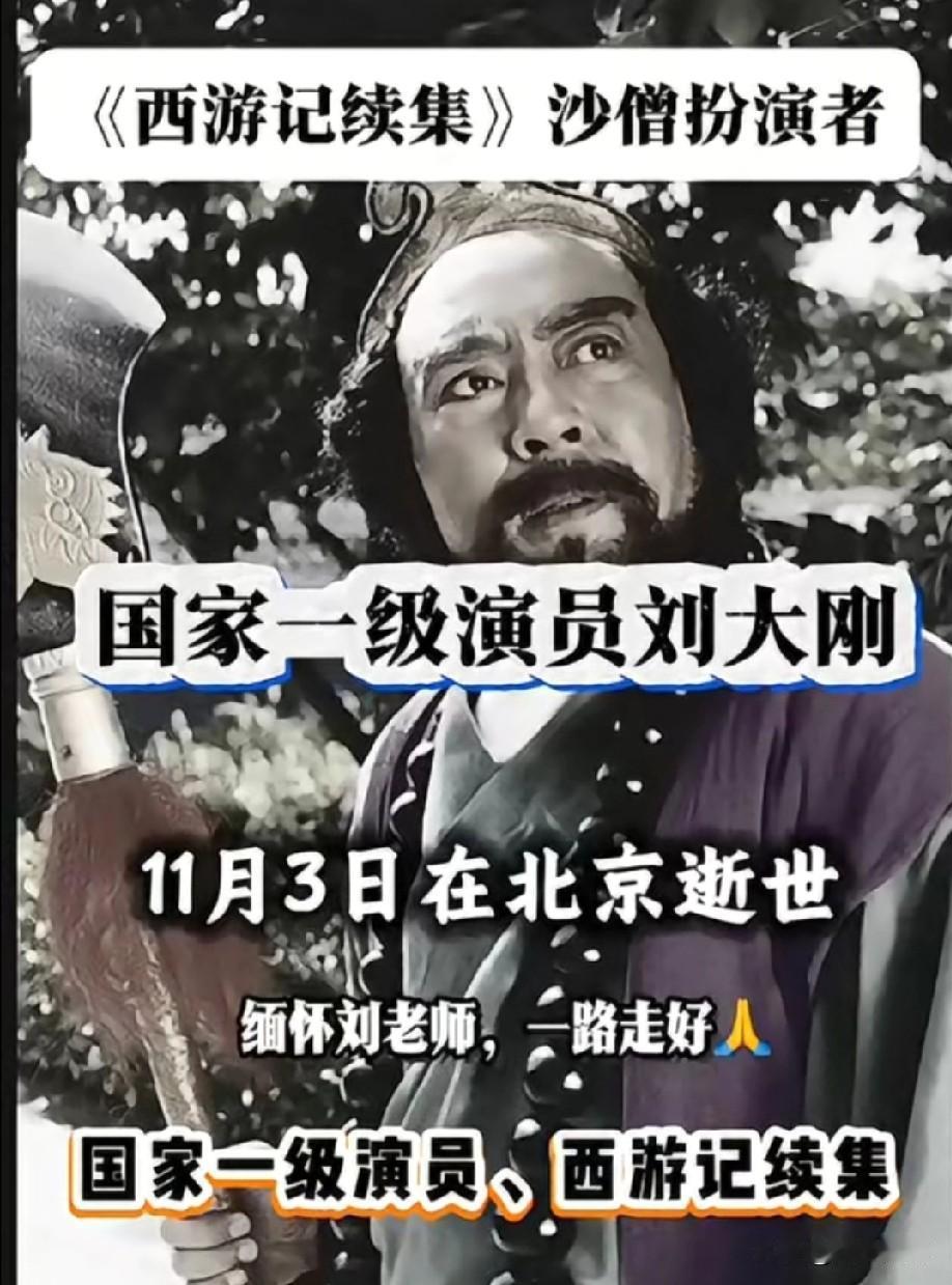 沙僧扮演者刘大刚病逝,享年78岁!六小龄童缅怀,一代人的童年回忆落幕 刚刷到消息,《西游记续集》里沙僧的扮演者刘大刚先生,11月3日在北京病逝了,终年78岁,心里一下子挺不是滋味的。 六小龄童还特意缅怀他,说他为人憨厚、热心肠,想想屏幕里那个任劳任怨、挑着担子护师父师弟取经的沙和尚,可不就和现实里的他一个样嘛! 小时候哪个暑假不是抱着电视看《西游记》啊?沙和尚那句“大师兄,师父被妖怪抓走了”,简直是刻在DNA里的台词。如今看着这些陪伴我们长大的老艺术家一个个离开,才突然发现,原来我们的童年也跟着慢慢远去了,自己也在不知不觉中变老。 生死本就是自然规律,不管是谁都逃不过。只能愿刘大刚老师一路走好,往生极乐,感谢他用精湛的表演,给我们留下了这么经典的角色和难忘的回忆。你们小时候看《西游记》,最喜欢沙和尚的哪个名场面呀?