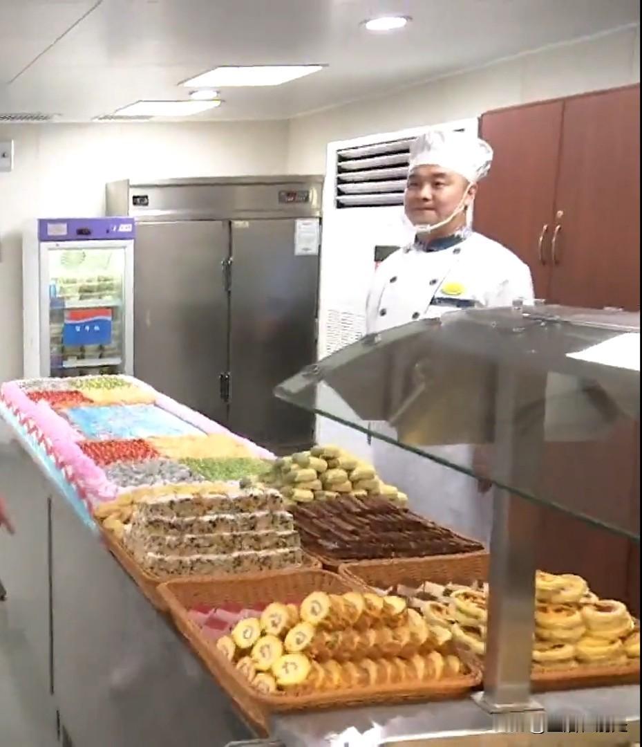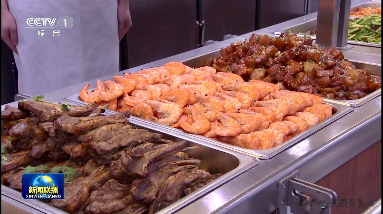 福建舰上的伙食,看得流口水……从画面看,应该有烤羊排、有大焖虾、有土豆烧牛肉,表面撒有葱花、芝麻,还有蒜苔炒肉,西红柿鸡蛋。菜品丰富多样,颜色搭配看起来很有食欲。 餐台上还有多种水果和堆叠的雪花酥、不同种类的糕点,如卷状糕点、环形糕点等),还有其他点心类食物。 背景中可以看到不锈钢的冷藏设备和橱柜,整体环境整洁,给人一种食品种类丰富、供应充足的感觉。 11月7日新闻联播,10多分钟都是报道福建舰入列。