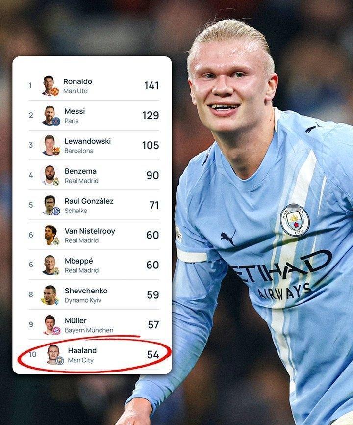 绿茵资讯! ★哈兰德以54球升至欧冠射手总榜第9位!关键他只用了52场比赛。 ★