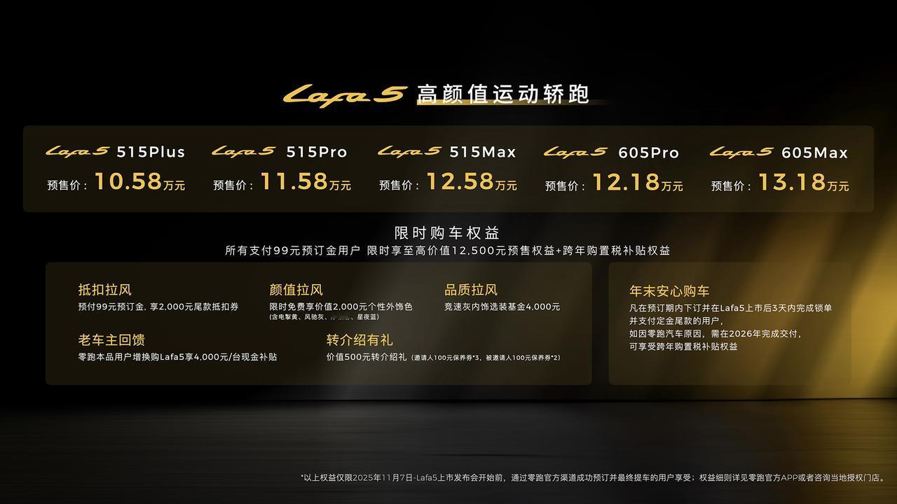 零跑Lafa5正式开启预售,预售价10.58-13.18万元~将于11月28日正式上市。 新车定位高颜值运动轿跑,基于LEAP3.5技术架构打造,由中欧联合底盘调校。 动力搭载160kW后置电驱,零百加速6.4秒,CLTC续航605km。 智能座舱搭载了高通8295P+8650旗舰芯片,并采用Leapmotor OS 4.0 Plus系统。 内部座舱得房率达到86%,并且软包覆盖率超80%,还拥有1.02㎡超大全景天幕与智能电动遮阳帘的组合。 辅助驾驶硬件方面,新车拥有融合激光雷达的27个高精度感知硬件,支持端到端辅助驾驶,可实现26项辅助驾驶功能。 零跑同步推出零跑Lafa5 Ultra版本,配备了专属运动套件,进一步优化空气动力学性能,Ultra版新车计划于2026年第二季度在中国大陆正式交付。【来自懂车帝车友圈】