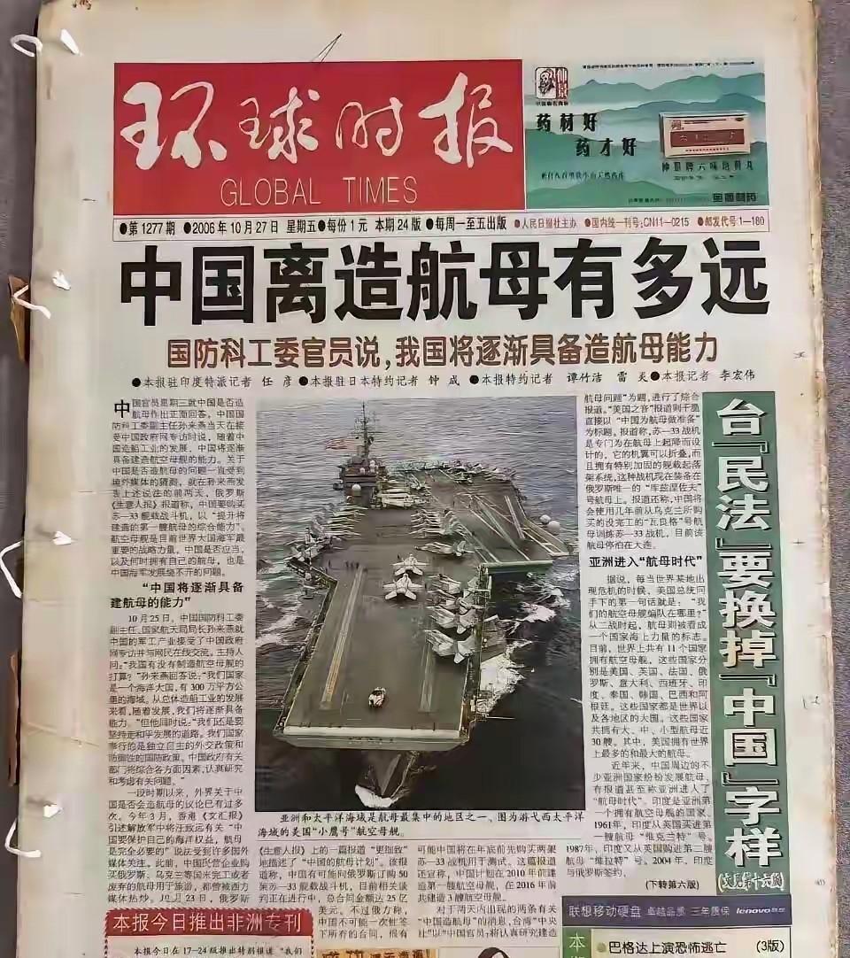 200年10月27日的一张环球时报,文章标题:中国离造航母有多远?文章中配图的航母则是,游弋西太平洋海域的美国“小鹰号”航空母舰,这艘航母于2009年5月份退役封存,2021年10月份被卖给拆船公司拆解! 2025年11月5日,随着全球首艘,采用常规动力电磁弹射的航空母舰“福建舰”正式入列,中国也正式进入三航母时代,从2012年中国第一艘航母“辽宁舰”入列,到2025年中国第三艘航母“福建舰”入列,在短短的13年时间里,中国已经拥有了三艘航母! 谁又能想到,从2006年环球时报上提出的那个设想:中国离造航母有多远?到现在的2025年中国三航母时代,也只过去了19年!
