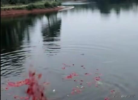 近日,湖南长沙县一鱼塘用辣椒喂鱼,鱼塘主包了600亩河塘养鱼,大概有2000多尾