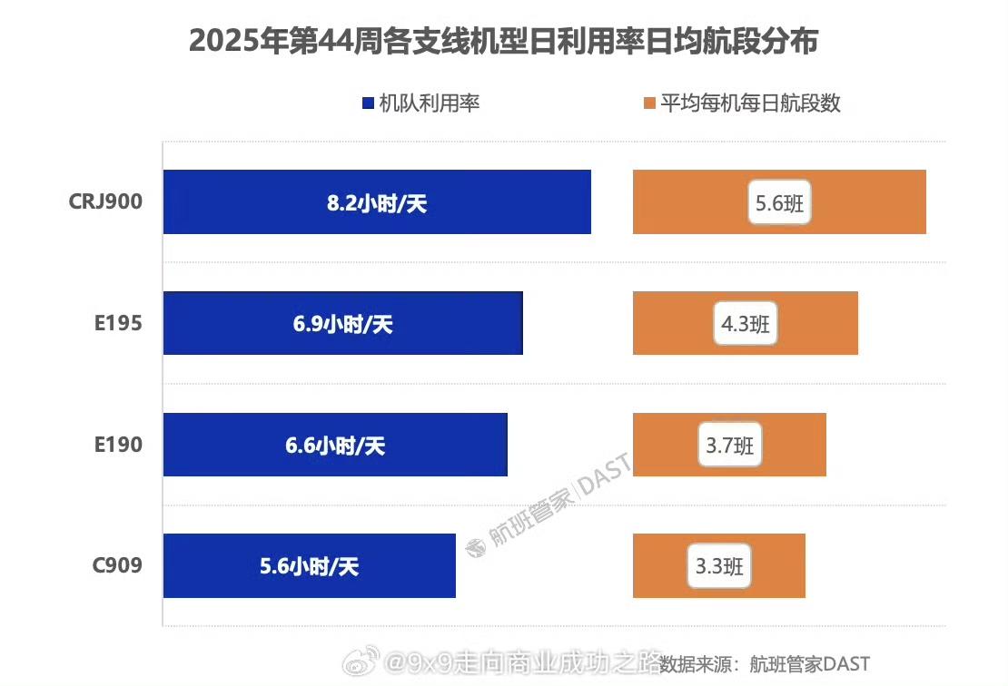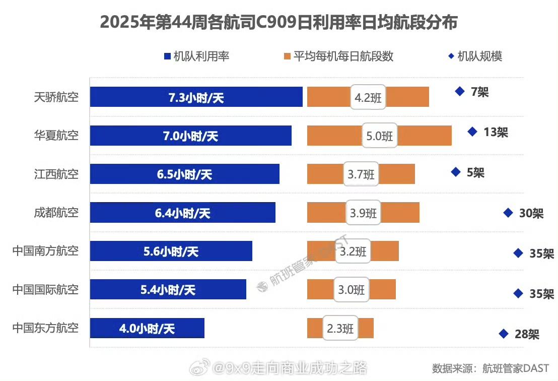 C909飞机的利用率还能大幅度提高,国内航空公司的利润率太低了! 按照航班管家的数据,2025年第44周,国内7支C909运营机队利用率排名中,天骄居首,华夏次之,东航继续垫底。 要求也不高,每天至少平均能保证6个小时以上的使用频率吧,不然使用频率太低了,肯定是挣不到钱的。 没想到位于内蒙古的天骄航空成为最大的黑马,竟然是使用C909飞机最频繁的航空公司。