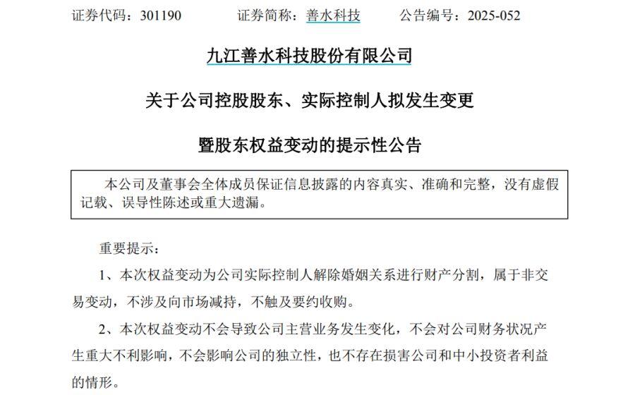 A股最近又现“天价”离婚事件。11月7日,善水科技公告其实际控制人黄国荣和吴新艳