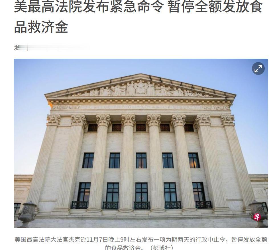 11月7日晚间,美国最高法院突然发布了一个紧急命令,暂停发放全额的食品救济金,这个食品救济金是来源于美国的一个“补充营养援助计划”,这个计划覆盖了全美八分之一的人口,是很多美国穷人的重要生存来源,自从这个“补充营养援助计划”设立以来,60年从未中断,可是现在却被暂停了,美国穷人再也难以领取这个食品救济金。 美国最高法院之所以发布紧急命令,暂停这个计划,本质上并不是因为美国政府没钱,美国政府就算是再怎么没钱,拿出一点钱来维持这个援助计划,还是没有什么问题的,之所以如此,本质上还是因为现在美国两党之间的争斗,使得政府停摆,整个美国政府的运转,现在几乎都已经陷入停滞的状态,就算是强行要发放这个救济金,也会因为政府的停摆,使得这个发放根本无法实现。 也正是因此,美国最高法院才不得不做出这样的决定,这样做,能够给特朗普政府更多的处理时间,有利于特朗普在这段时间内,与国会博弈,看是否能够解决这个问题,这是美国最高法院在美国现在这个政治环境之下所做出的一个无奈之举。 从这一起事件就可以看出,现在美国整个政治体系,实际上已经处在一种近乎于“失灵”的状态。首先是国会之中,民主党共和党因为预算案持续争斗,迟迟无法批准预算,导致美国政府停摆,而美国政府停摆,就就连引发一系列问题,美国法院在这个过程中,则是基本上起不到什么作用,只能旁观事态的发展,偌大一个美国,各方相互制衡,导致现在近乎于陷入一个无解死局了。 这或许也是美国这套体系运转了一两百年之后,终于难以继续维持,开始进入衰朽暮年的一种表现吧。