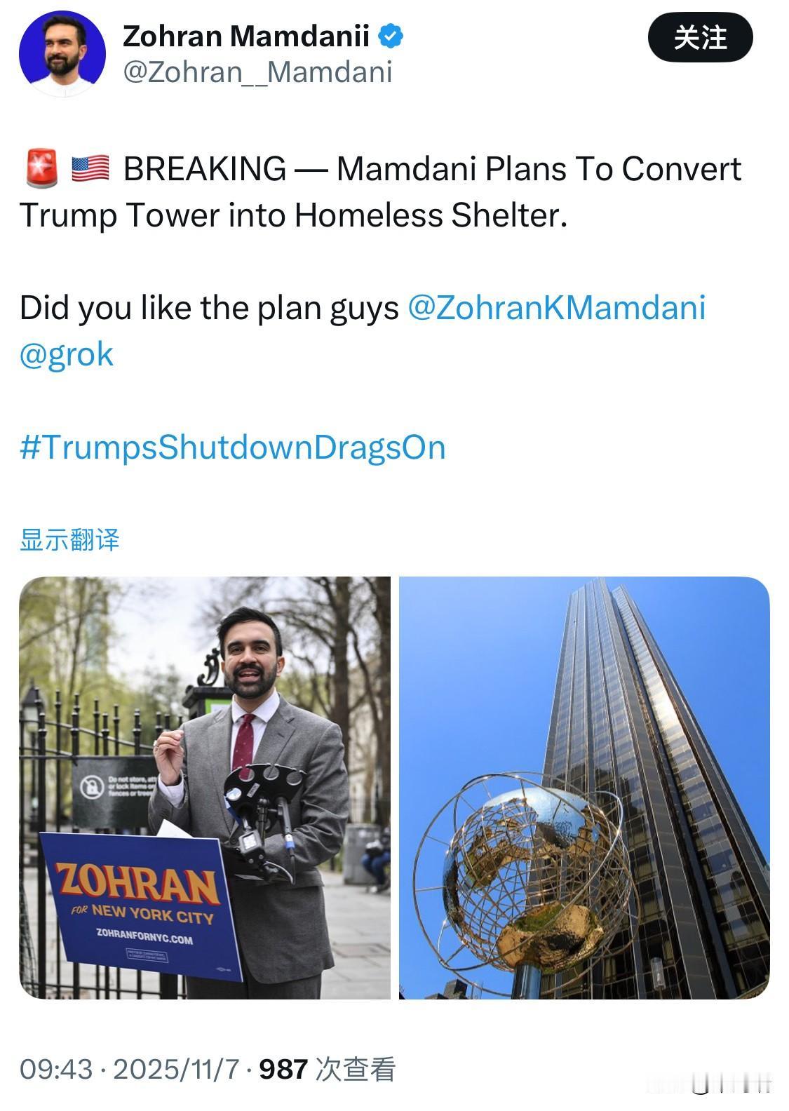 突发新闻——纽约市当选市长马姆达尼计划将特朗普大厦改建为无家可归者收容所。