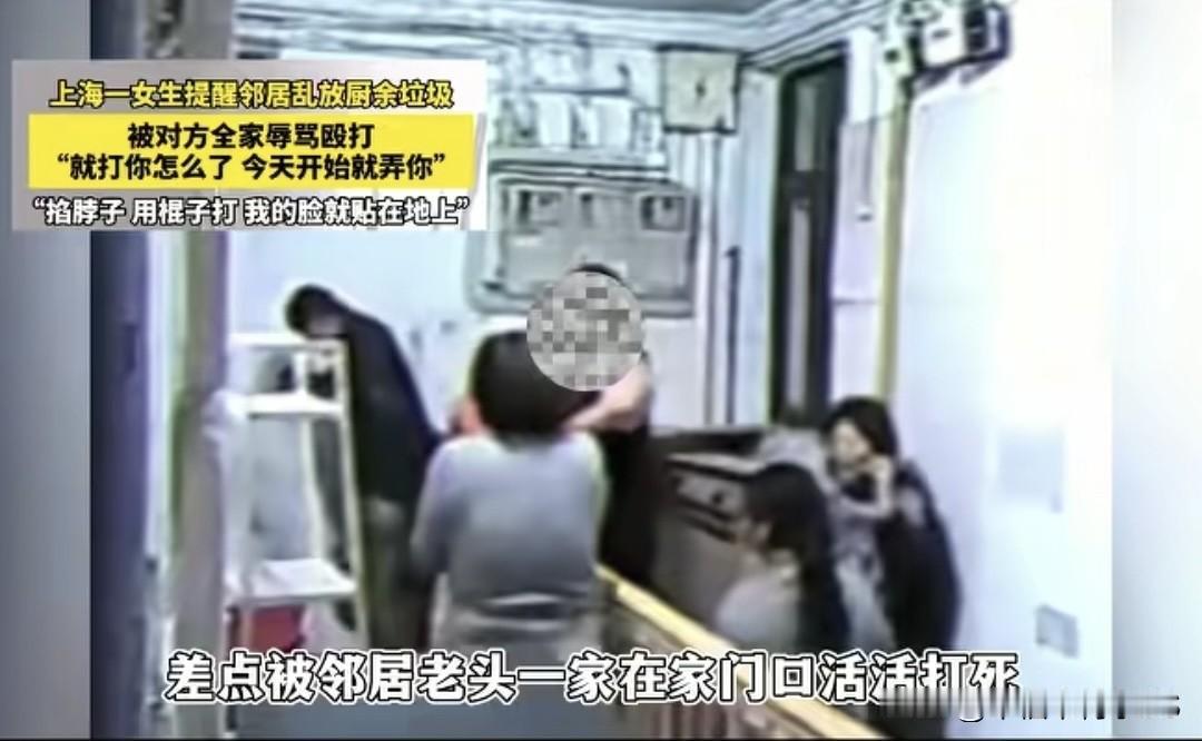 上海独居女生遭恶邻狂虐!80岁老头扔垃圾堵门,仨大汉围殴暴打太嚣张 在上海打拼的独居女生本以为能安稳生活,结果碰上一群“恶邻”隔壁80岁的老头直接把各种垃圾,甚至带着馊味的厨余往她家门口堆,地上黏糊糊的剩饭剩菜还招了一堆蚊虫这日子还咋过? 姑娘的表姐看不下去,就去跟邻居说“别把垃圾放我家门口”,就这么一句正常提醒,邻居全家跟炸了锅。80岁老头先冲出来推搡辱骂监控拍得清清楚楚他动手,他还倒打一耙说自己被推了。 接着更离谱,老头的儿子和一个五十多岁的壮汉也冲出来,仨大男人对着一个女生拳打脚踢,还把她逼到监控拍不到的角落,摁地上用棍子砸。 最后帽子叔叔来了,这家人当着执法记录仪还敢打人,事后居然还联合其他邻居做伪证非说自己是被欺负的。幸好姑娘家门口装了监控,不然真是有嘴说不清。对此你怎么看?