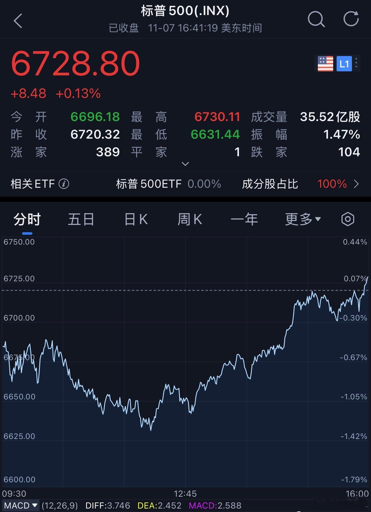 昨夜美股市场上演V型反转,标普、道指尾盘转涨。