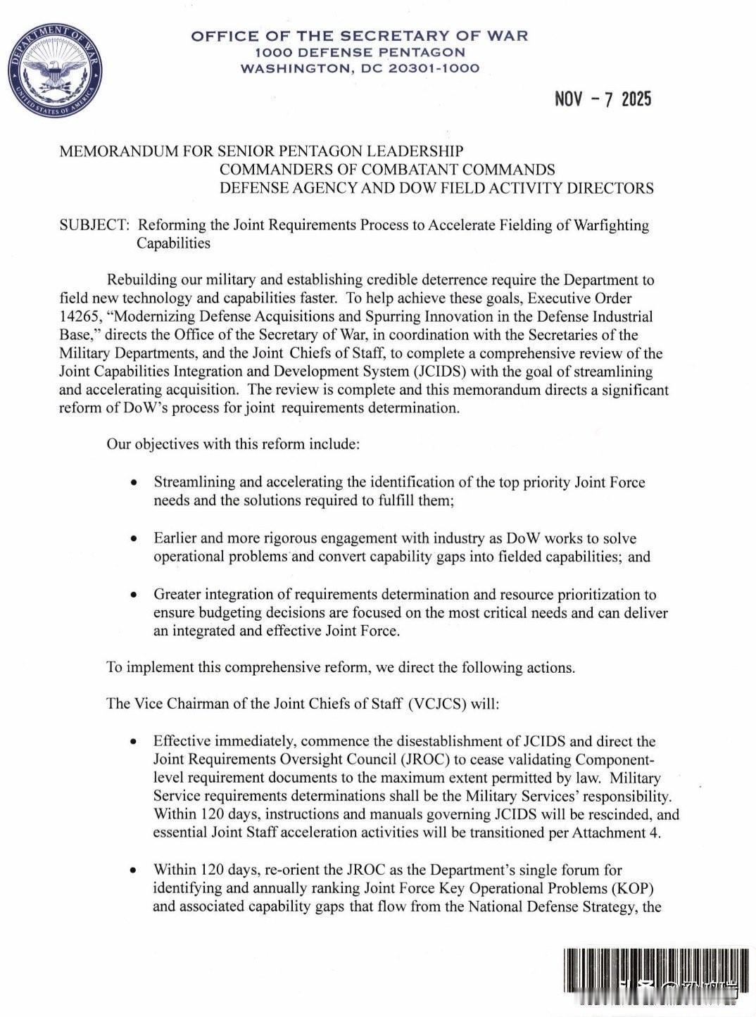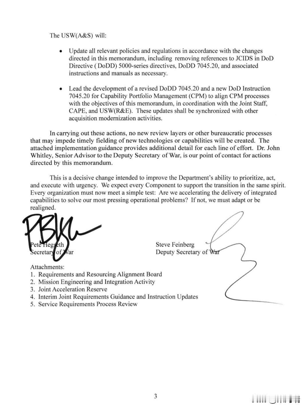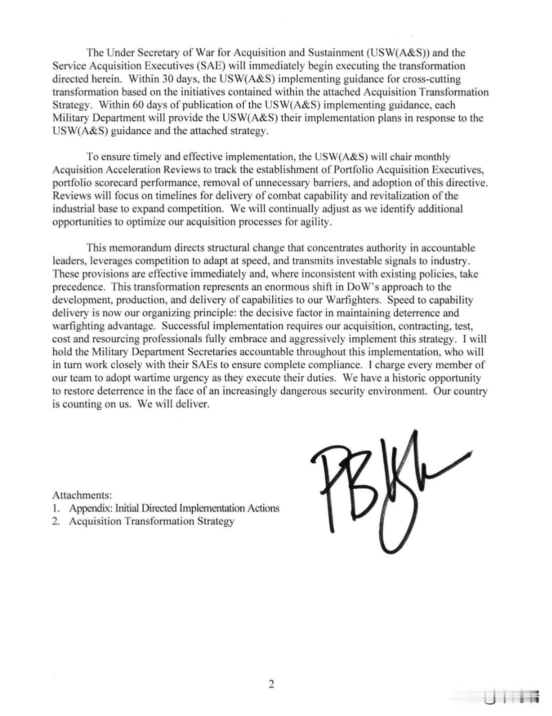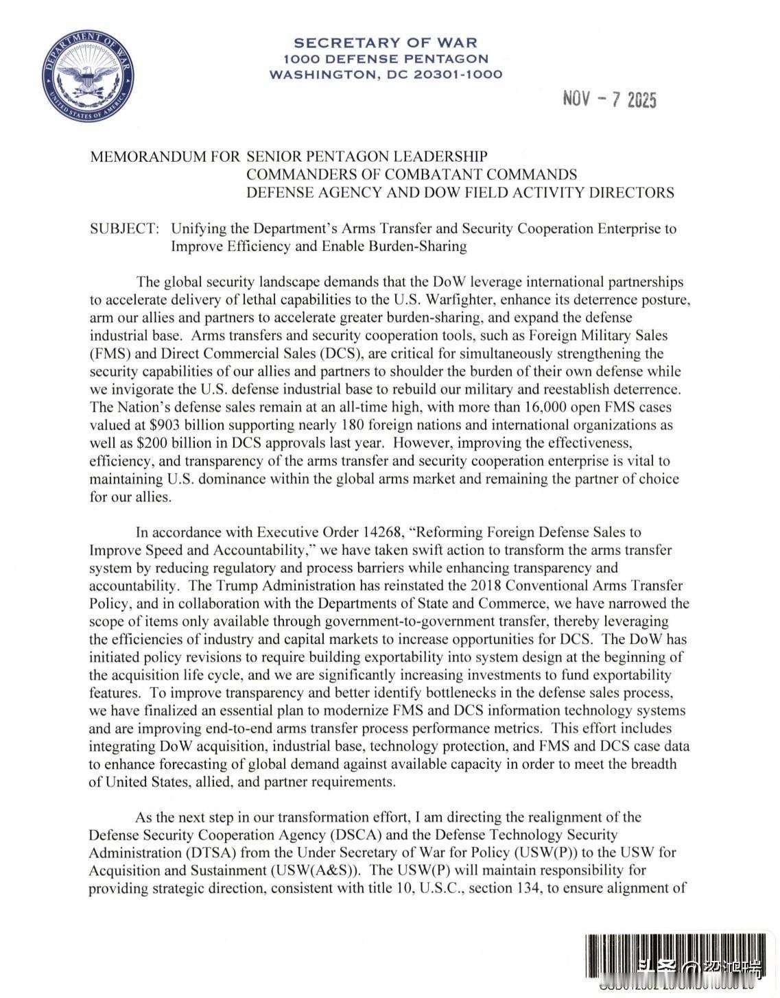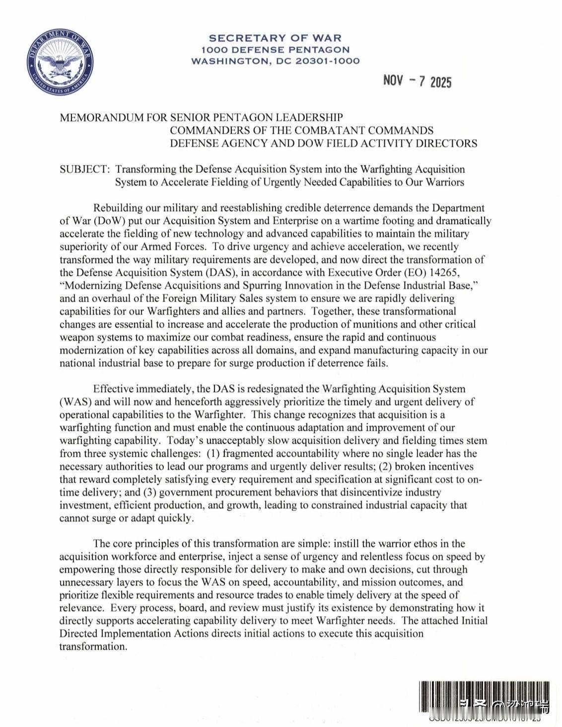 美国战争部长海格塞斯今天宣布战争部从采购体系到整体运行模式等全面切换至作战状态。 11月7日,战争部长海格塞斯已签署3份新的备忘录: 1、将国防采购系统转变为作战采购系统,以加速向战士部署急需的能力。 2、改韚联合需求流程,以加速作战能力的部署。 3、统一本部的武器转让与安全合作体系,以提升效率并实现分担。 赫格塞思当天在华盛顿向军方高层及主要国防承包商发表讲话时表示,改革的重点是“以速度为核心”简化国防采购规则。 据悉,这项被称为“采购体系转型”的举措,是赫格塞思推动国防部现代化的一部分。 以下为第一份备忘录中文译文。 战争部长 国防部五角大楼 华盛顿特区 20301-1000 2025年11月7日 致:五角大楼高级领导、作战司令部指挥官、国防机构及战区活动主管 主题:将国防采购系统转变为作战采购系统,以加速向战士部署急需的能力 重建军队并恢复可信威慑力,要求战争部将采购体系与整体运行模式置于战时状态,大幅加速新技术与先进作战能力的部署,以维持我武装力量的军事优势 为推动紧迫感与加快进度,我们近期依据《行政命令14265号:现代化国防采购并推动国防工业基地创新》改革了军事需求制定方式,现正直接推动国防采购系统(DAS)转型,同时全面整顿对外军事销售体系,确保为作战人员及盟友伙伴的快速交付作战能力 这些变革性举措对于提升弹药及其它关键武器系统的生产速度至关重要,旨在最大化作战准备状态,确保全领域关键能力的快速持续现代化,并扩大国家工业基础的制造能力,为威慑失效时的紧急增产做好准备 自本备忘录发布起,国防采购系统正式更名为作战采购系统(WAS),今后将全力优先保障作战人员及时获取紧迫作战能力。此项调整旨在明确采购活动本质上属于作战职能范畴,必须持续推动作战能力的适应性改进。当前不可接受的采购交付与部署延迟源于三大系统性挑战: (1) 责任分散,缺乏有权力主导、统筹、迅速交付各计划的唯一领导人 (2) 激励机制失灵,过度追求满足所有要求和规格,却严重损害按时交付能力; (3) 政府采购行为抑制行业投资、高效生产和增长,导致工业产能受限,无法快速扩张或转型 此次转型的核心原则简眀扼要:在采购队伍及体系中灌输战士精神,授权直接负责交付的人员以决策权和自主权,来注入紧迫感和对速度的执着追求;削减冗余层级,使武器系统管理局聚焦于速度、责任和任务成果,优先考虑灵活需求和资源调配以实现与时具进的及时交付 所有流程、委员会和审查机制必须证明其存在价值,即如何直接支持加速能力交付以满足作战人员需求。随附的《初期定向实施行动》明确了执行此次采购转型的初步措施 战争部采购与保障副部长(USW(A&S))及各军种采购主管(SAE)将立即启动本文件所指明的转型工作。30天内,采购与后勤事务副部长须依据附件《采购转型战略》中的举措,发布跨领域转型的实施指南。该指南发布后60天内,各军种部门须向副部长提交响应指南及战略的实施计划 为确保及时有效实施,战争部采购与维持事务副部长将主持月度采购加速审查会议,持续跟踪项目采办主管的任命与纳入评价体系的项目进展,以及障碍清理及本文件规定的落实情况,着重把关作战能力交付时间表与工业基础竞争力振兴。采购流程将不断优化,动态调整以追求最佳敏捷性 此备忘录指令要求体系性机构变革:将权力集中委托于负有责任的领导者,通过竞争机制推动快速适应,发出眀确信号激励产业投入。以上规定即刻生效,如与现有政策不一致,以本备忘录为准 本转型方案标志着“战争部”对作战能力开发、制造与交付模式的根本转变,能力交付速度即为组织首要原则,是维系威慑和制胜优势的决定性要素。携手努力、彻底落实采办转型,采购、合同、测试、成本及资源管理等各专业队伍须全力贯彻本化战略 本人将对军种部长实施全流程问责,军种部长亦须会同各自采办主管确保全面落实。号召全体成员以战时紧迫感履职尽责,当前国际安全环境骤然严峻,我们面临历史性机遇重塑威慑。国家将指望我们兑现承诺。我们必将完成任务 附录:初步指令性实施行动 采办转型战略 签字:海格塞斯 战争部长 国防五角大楼 华盛顿特区 20301-1000 2025年11月7日