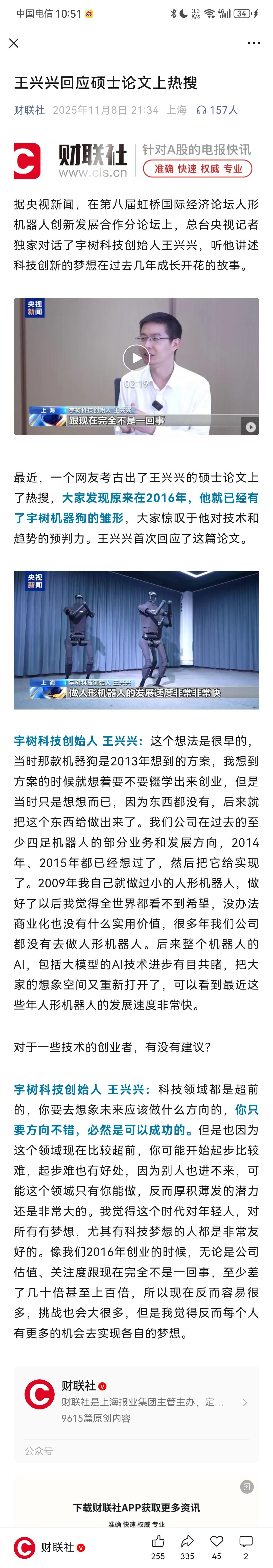 原来王兴兴从一开始就那么牛逼!近日,王兴兴在接受央视记者采访时说到,他其实在2013年就已经有了一个四足机器狗的方案,而后在2016年将这个想法写成了论文,接着就开办公司,将这个想法彻底落地,成功地研发出了宇树四足机器狗,一下子就成为这个领域的王者。 王兴兴1990年出生,2013年他才23岁,正是刚刚上大学的年纪,还很年轻,可是在那个时候,他的想法就已经屹立在了机器狗这个领域的最前沿,后续四足机器狗的发展,基本上就是在他的想法构思之下向前不断发展的,这种对于技术与趋势的判断力,简直令人震撼。 看完这个访谈我才知道,原来王兴兴从一开始就那么牛逼!果然天才就是天才,难怪王兴兴能够创立宇树这样的公司,这不是什么误打误撞,也不是什么恰巧占据了先机,根本上只是因为王兴兴在机器狗、机器人这一个领域,拥有着真正的天才级的创造力!