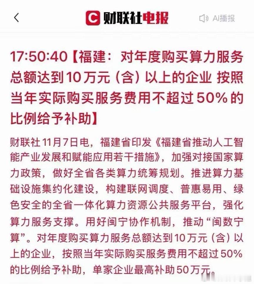 福建:对年度购买算力服务总额达到10万(含10万)以上的企业按照实际购买服务费用不超过50%的比例给予补助。这对于算力板块也是实实在在的利好,估计下周一也会有所表现。