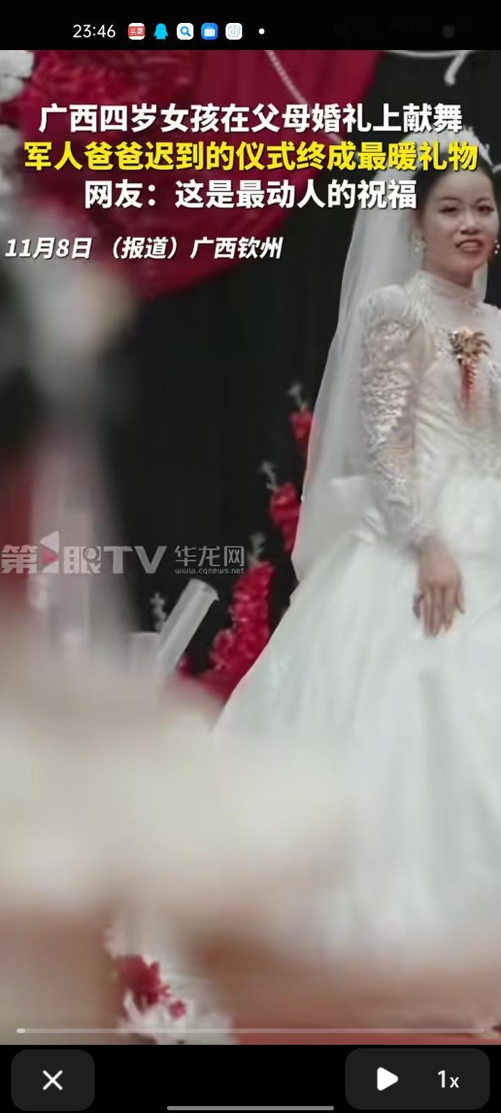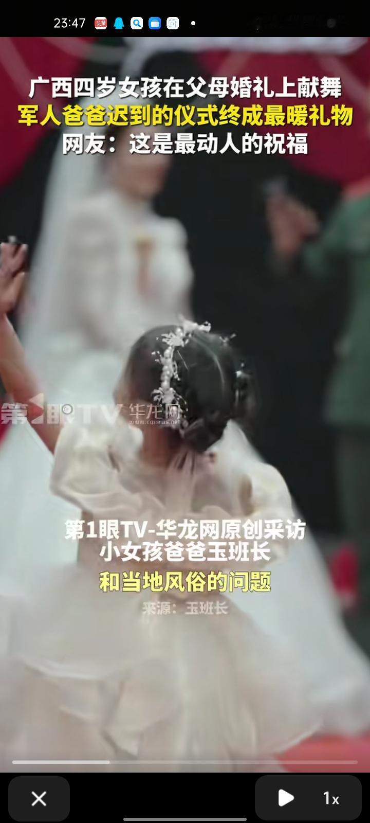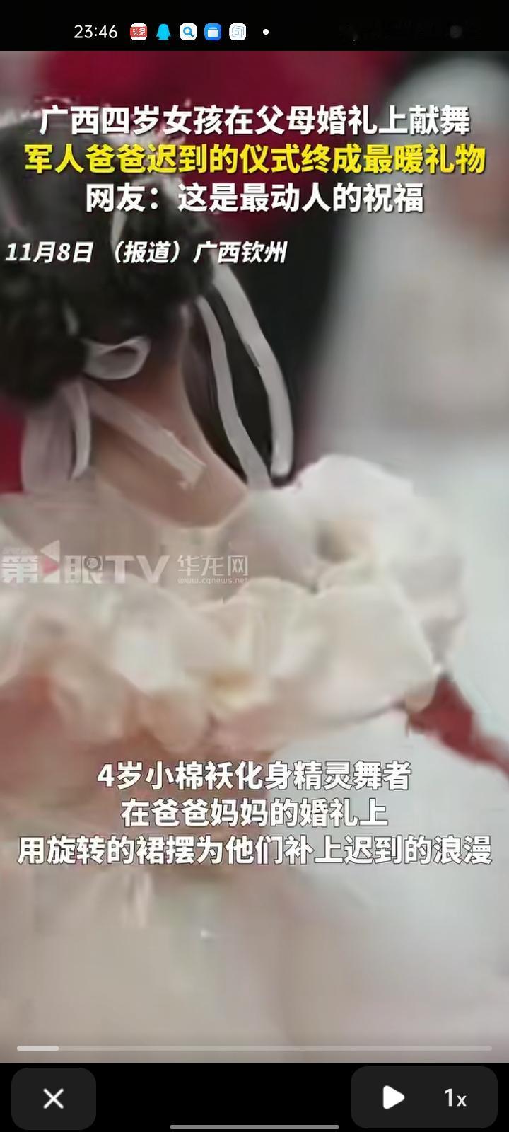 11月3日,广西钦州。四岁女孩化身精灵舞者,在爸爸妈妈的婚礼上,用旋转的裙摆为他们补上迟到的浪漫。 孩子爸爸表示,因为工作和当地风俗的问题,耽误了举办婚礼。为了补办这场婚礼,我筹备了很久很久。女儿四岁多,平常是她妈妈教她的一些舞蹈动作。那天刚好问她要送爸爸妈妈什么礼物,她说跳段舞,