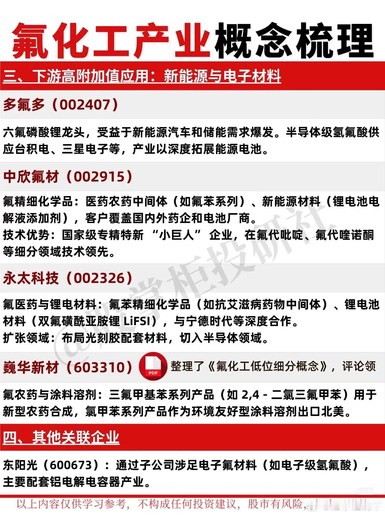 - 氟精细化学品(如医药农药中间体、电解液添加剂),国家级“小巨人”企业,技术领先于氟代吡啶、氟代喹诺酮等领域。