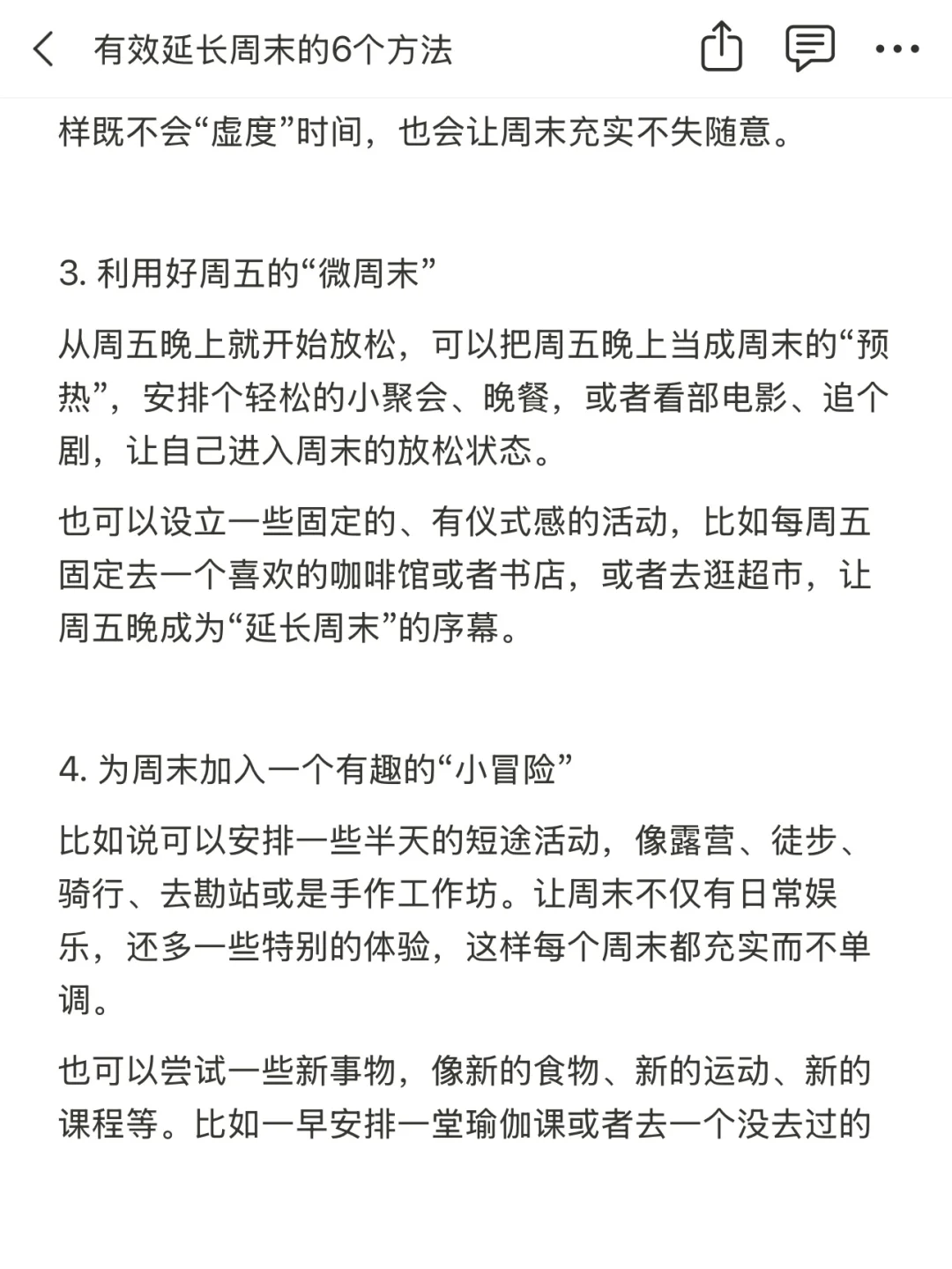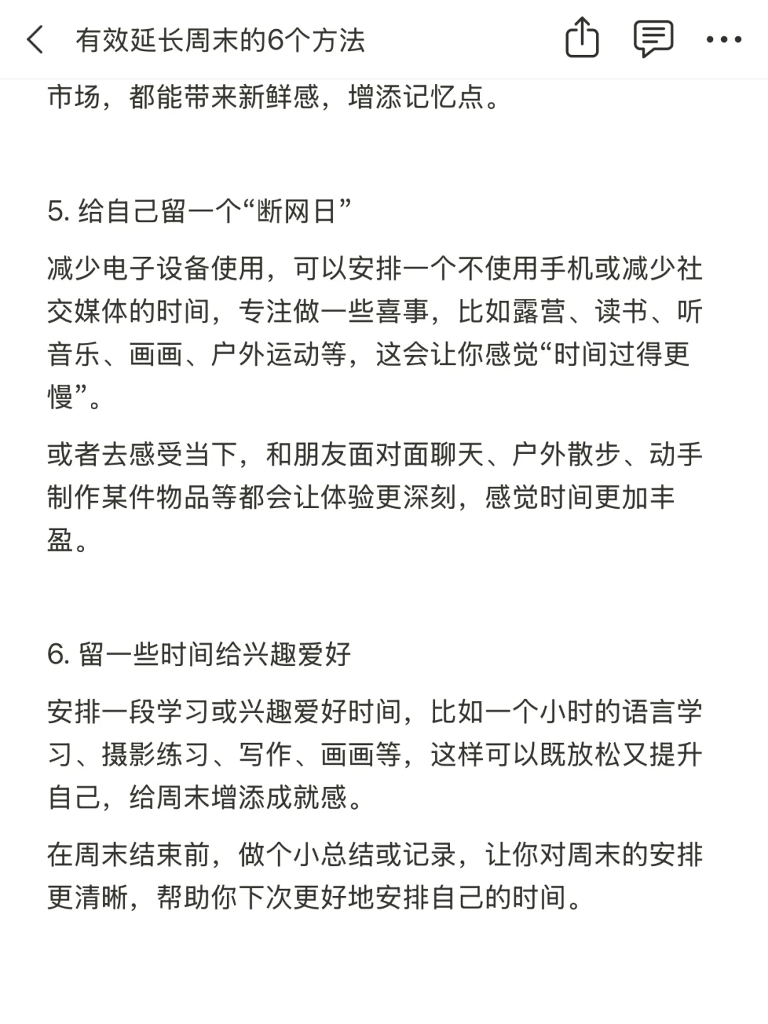 1.不要报复性熬夜,早睡早起 2. 提前制定周末计划 3. 利用好周五的“微周末” 4. 为周末加入一个有趣的“小冒险” 5. 给自己留一个“断网日” 6. 留一些时间给兴趣爱好 . 都是亲测有效的方法,希望对大家有用! . 不仅会分享真实有效的职场信息,还会不断分享成长干货,帮助大家提升自我! .